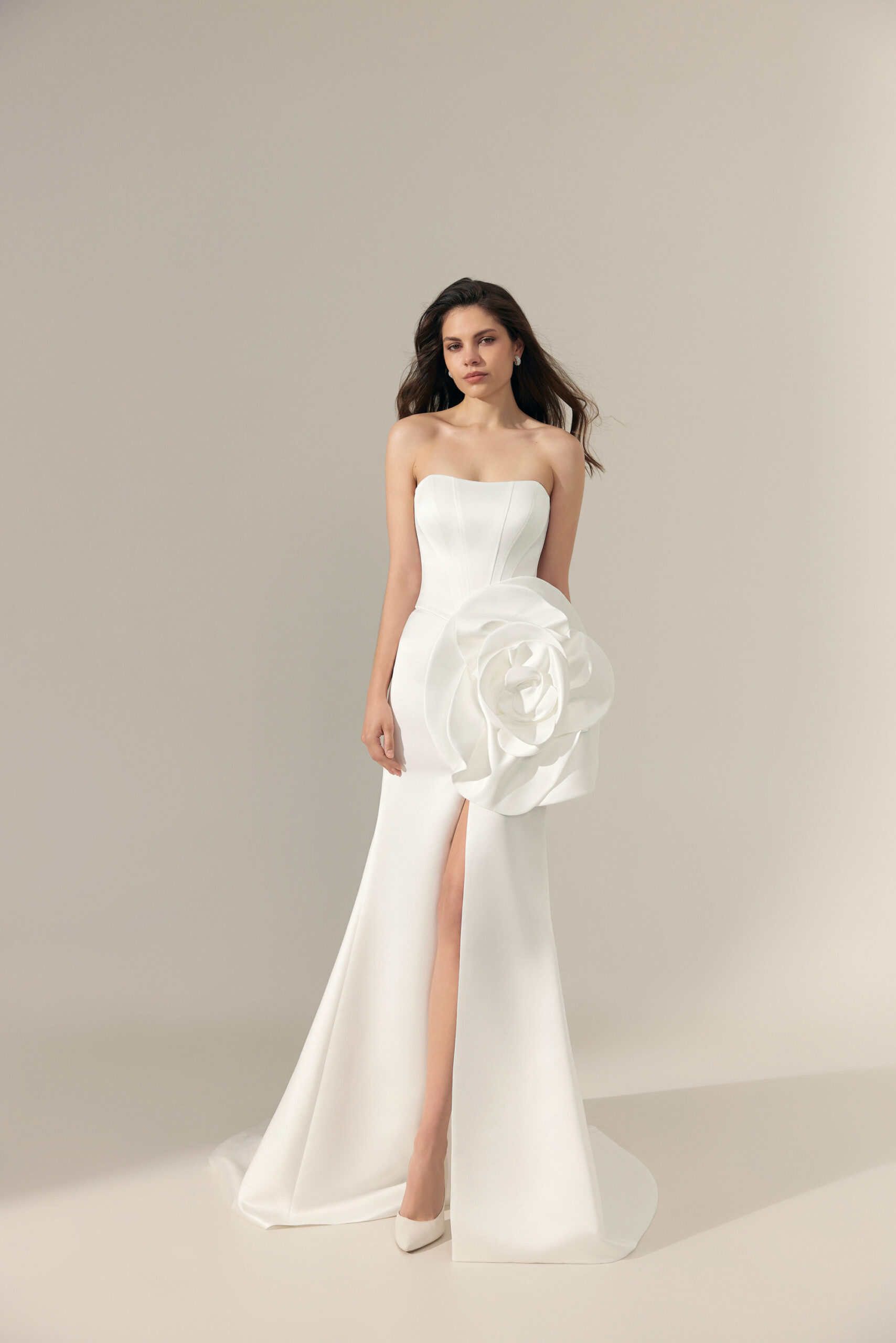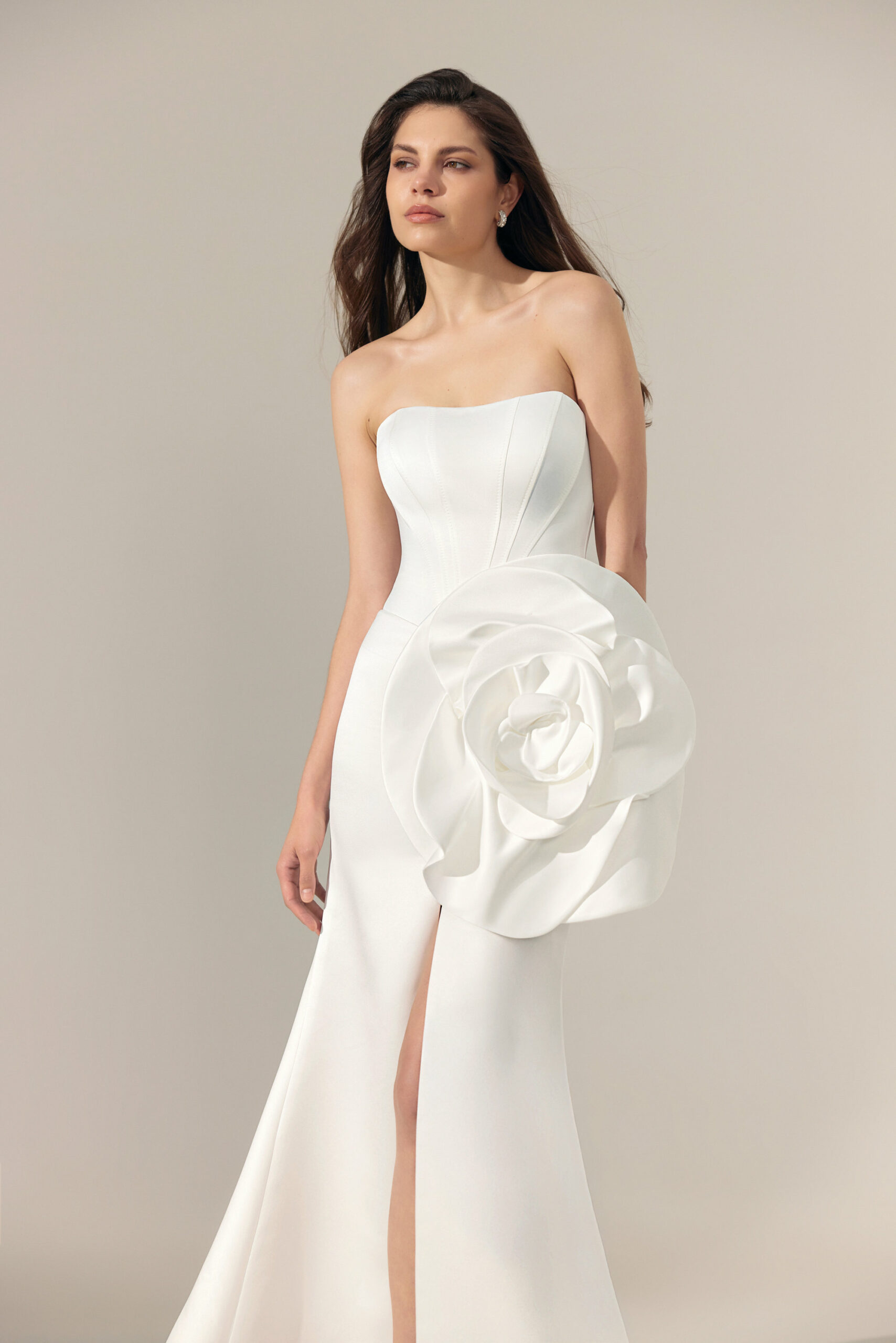 Robe de mariée minimaliste Mix & Match avec décor floral en sus.