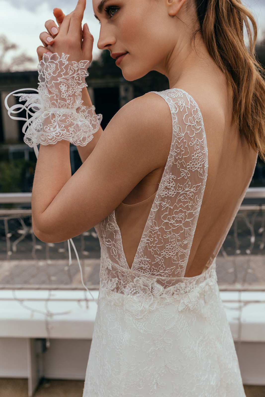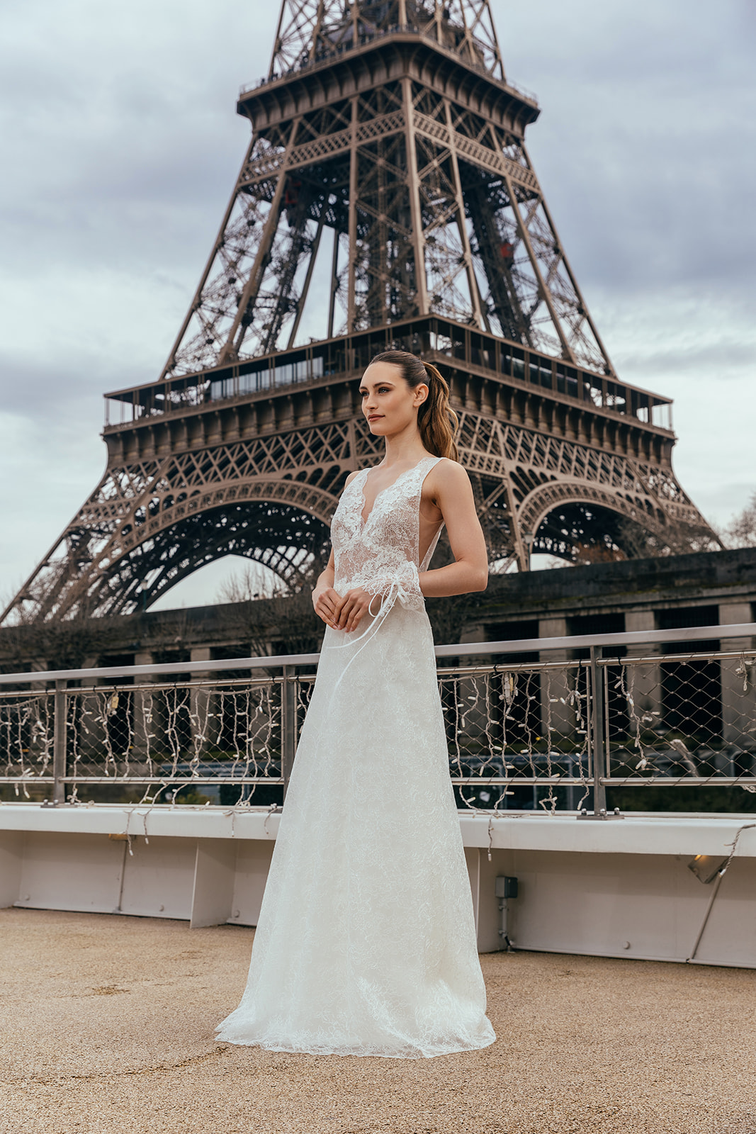 Anne de Lafforest pour Cymbeline. Une robe de mariée A-line bohème chic en tulle brodé. Le corsage en tulle brodé, tout en jeu de transparence et rebrodé de détails fleuris, est à la fois romantique et glamour. Le décolleté devant en V est sublimé par ses motifs de tulle brodé, et sa découpe sous poitrine. La taille est soulignée par l’effet d’une large ceinture, qui affine la silhouette avec beaucoup de féminité. Le décolleté dos carré plongeant est des plus glamour et original, pour un effet couture et sensuel. Le corsage est magnifié par ses découpes en tulle effet illusion sur les côtés, offrant un style audacieux et moderne. La jupe ligne A sublime l’allure grâce à son petit volume. Entièrement recouverte de tulle brodé de motifs floraux, la jupe est résolument poétique et romantique. Une robe de mariée bohème et glamour, idéale pour un mariage moderne et élégant.