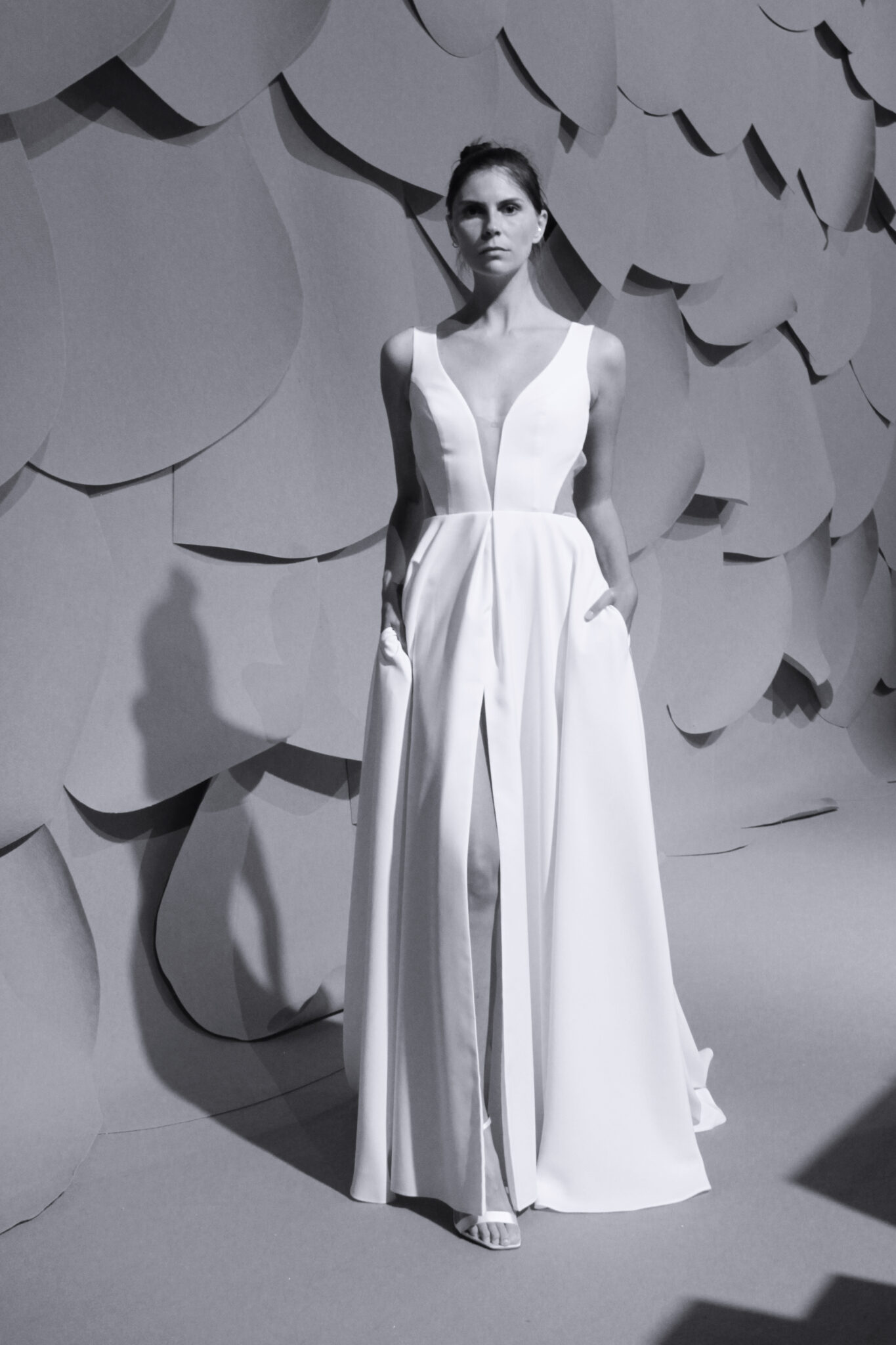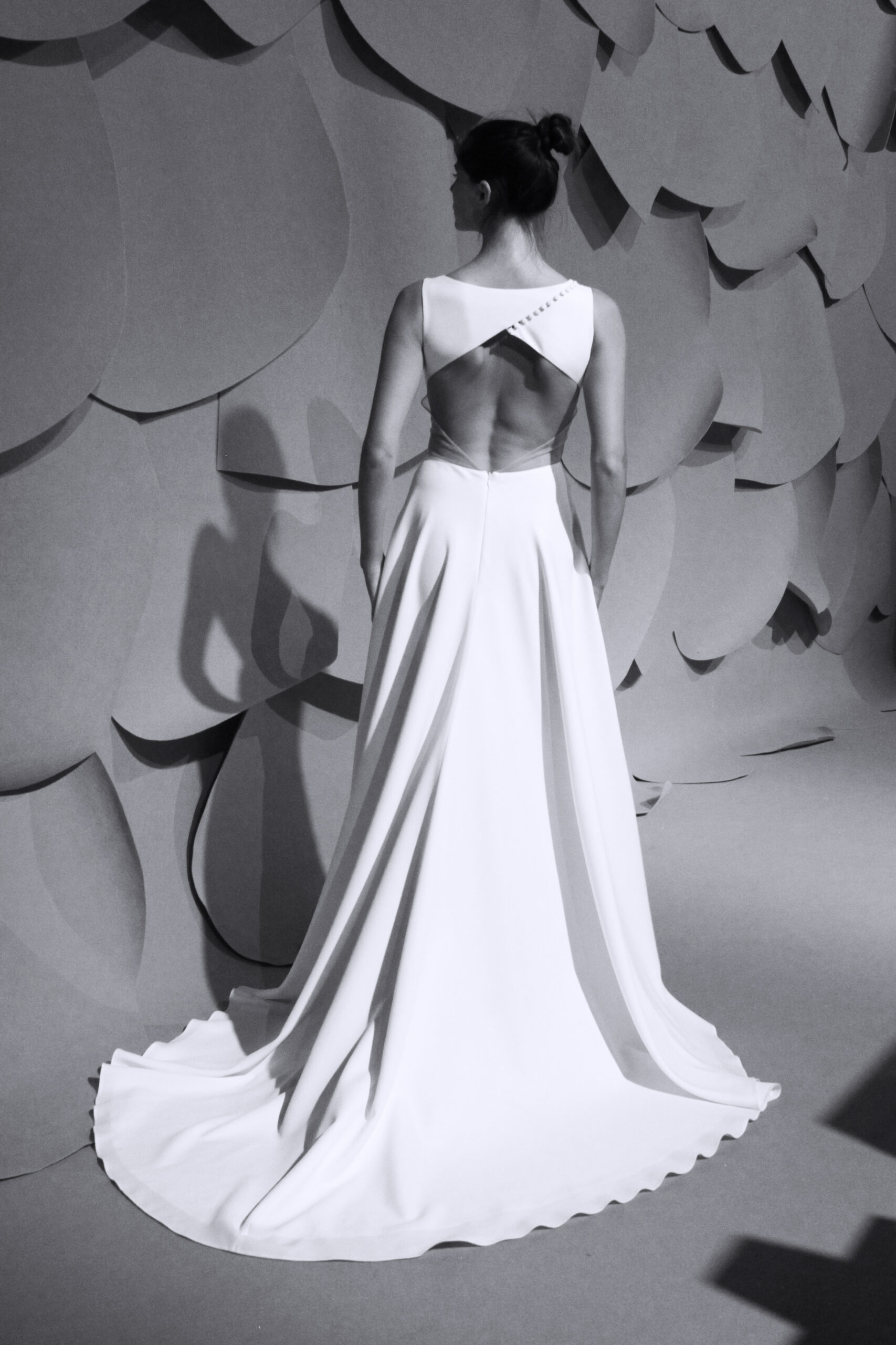 Une robe de mariée A-line épurée en crêpe. Le corsage est magnifié par un décolleté en V effet illusion, et un jeu de transparence sur les côtés. Son encolure au dos, est fermée par d’élégants boutons en asymétrie. Le profond décolleté dos donne toute l’élégance et l’originalité à cette robe de mariée moderne. La jupe ligne A et à plis creux en crêpe, est sublimée par une fente sur le milieu devant, apportant une touche de glamour.