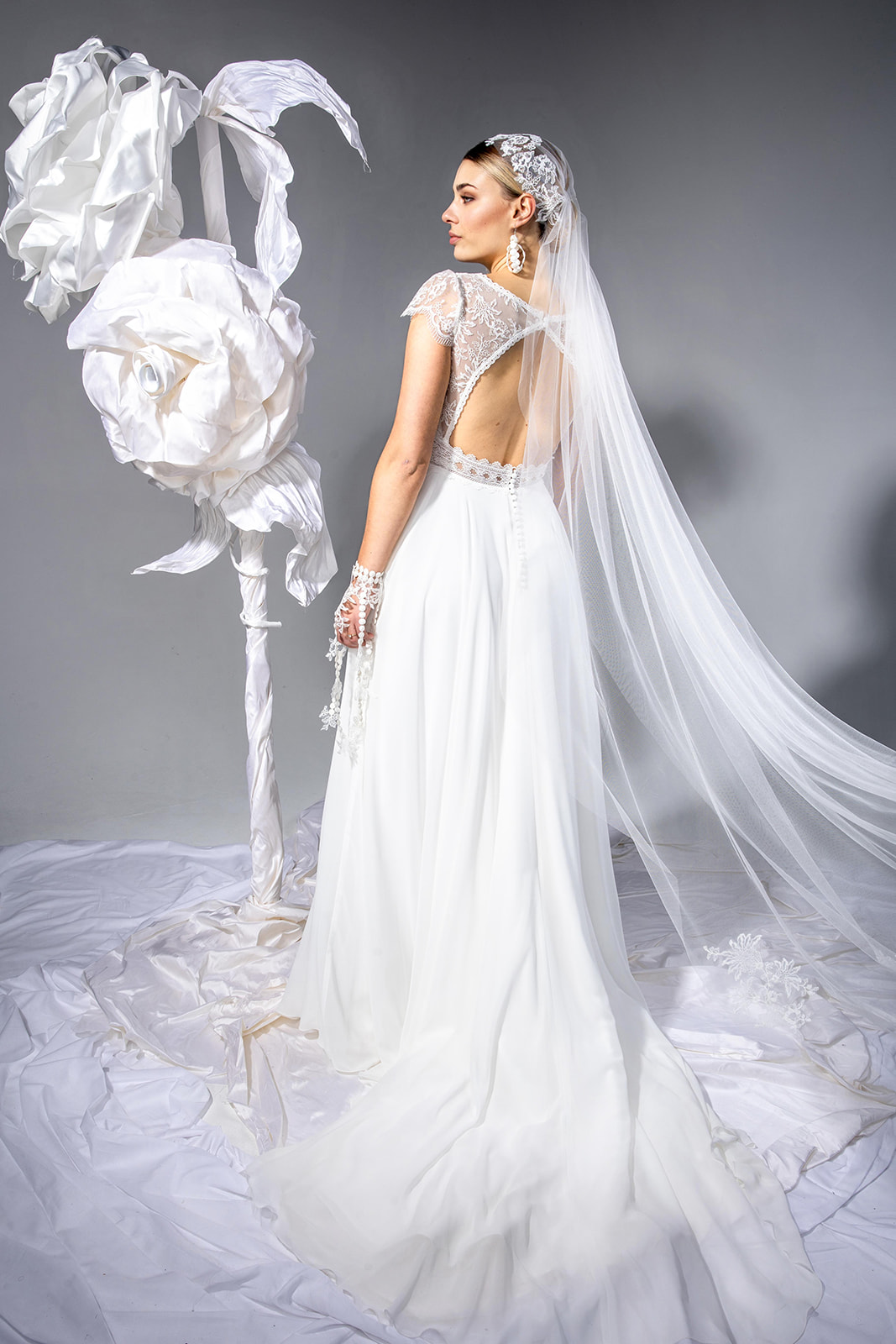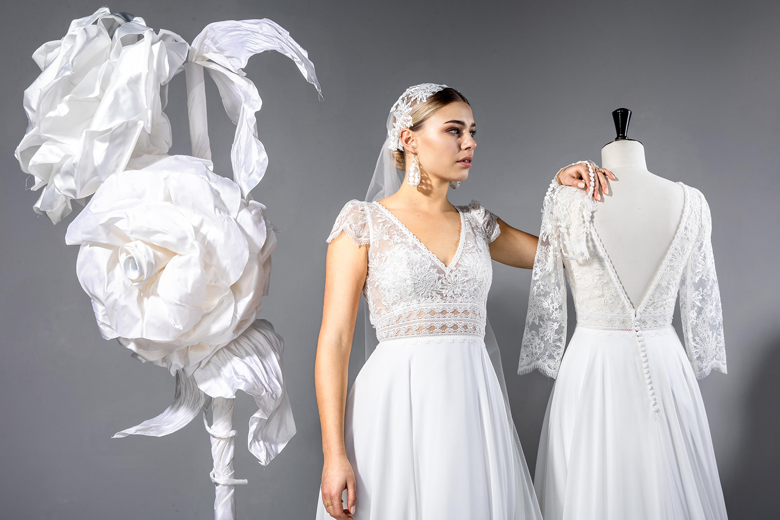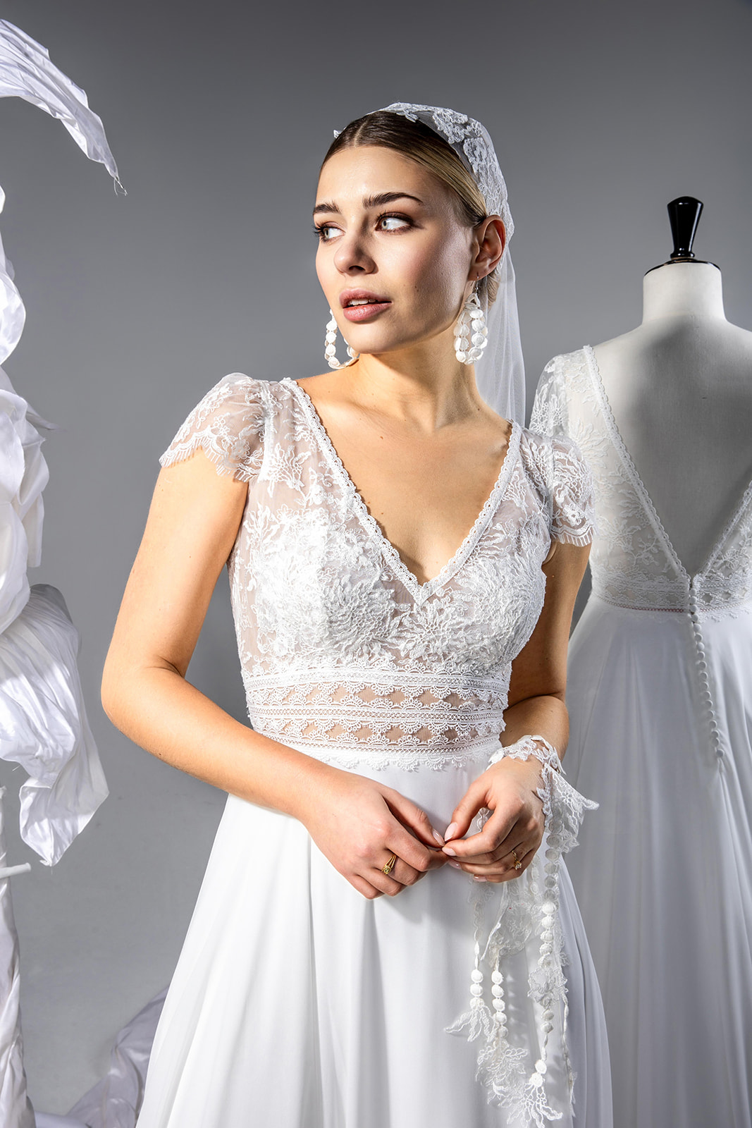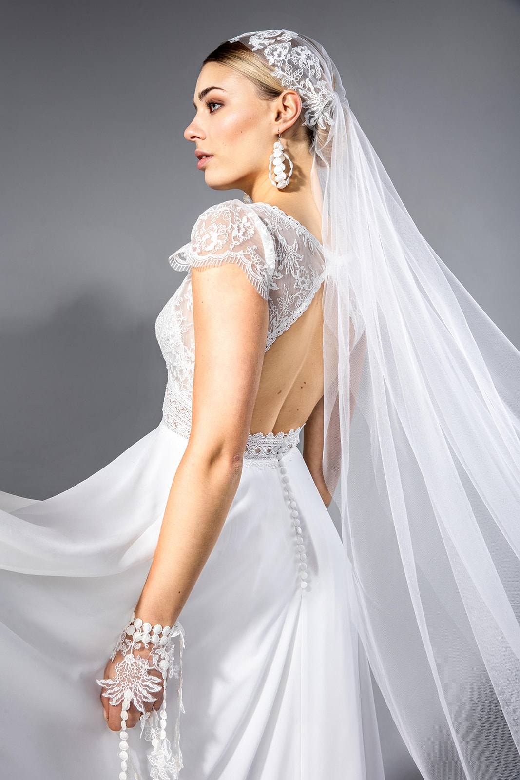 Une robe de mariée A-line bohème chic en dentelle et en mousseline. Un top tout en dentelle et jeu de transparence agrémenté de galons à la taille. Un décolleté en V devant, bordé d’un élégant galon de dentelle. Un décolleté dos glamour, fermé par un joli bouton recouvert. De petites manches apportent de la féminité, et subliment les épaules. Légère et épurée, tout en fluidité, la jupe en mousseline donne à cette robe de mariée un esprit bohème. Un délicat boutonnage ferme la jupe. Agréable à porter, elle sera parfaite pour un mariage bohème ou encore champêtre.