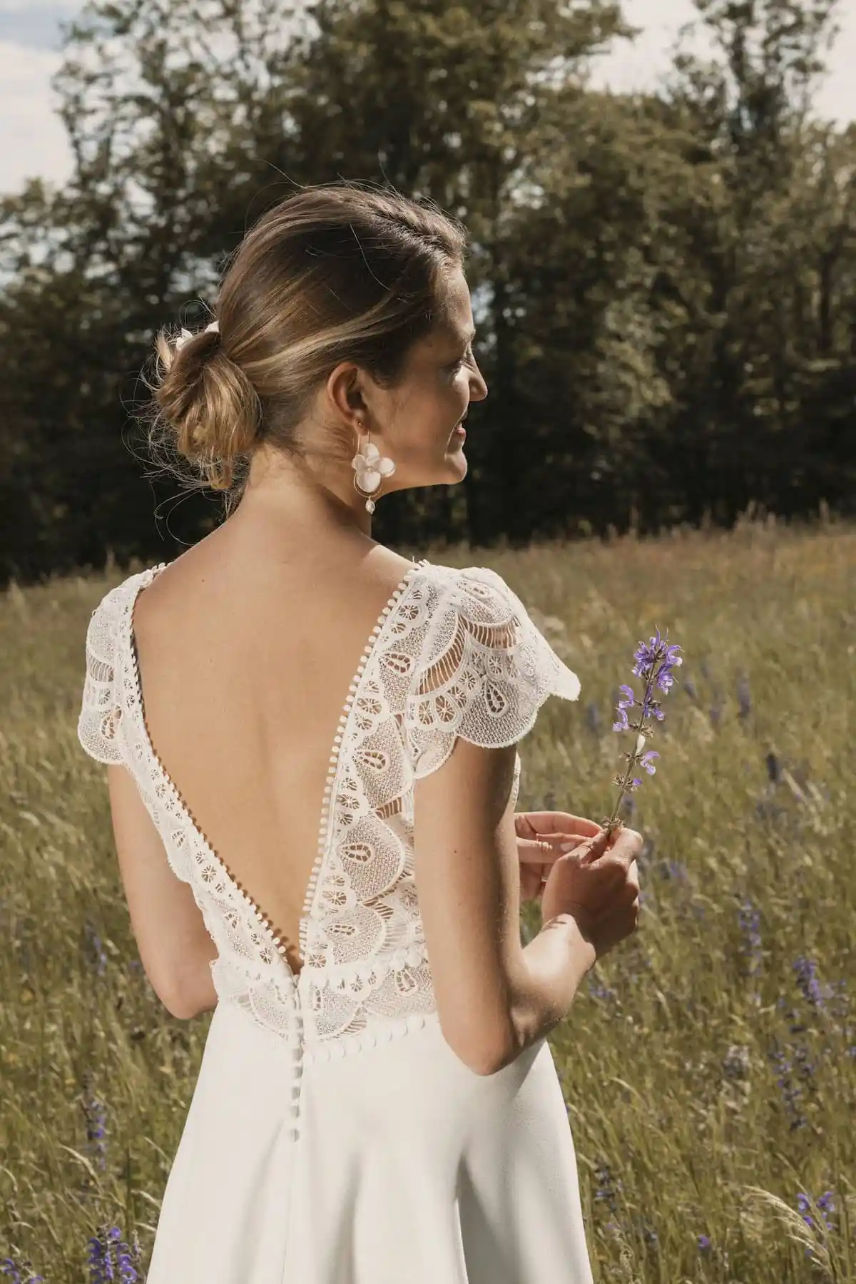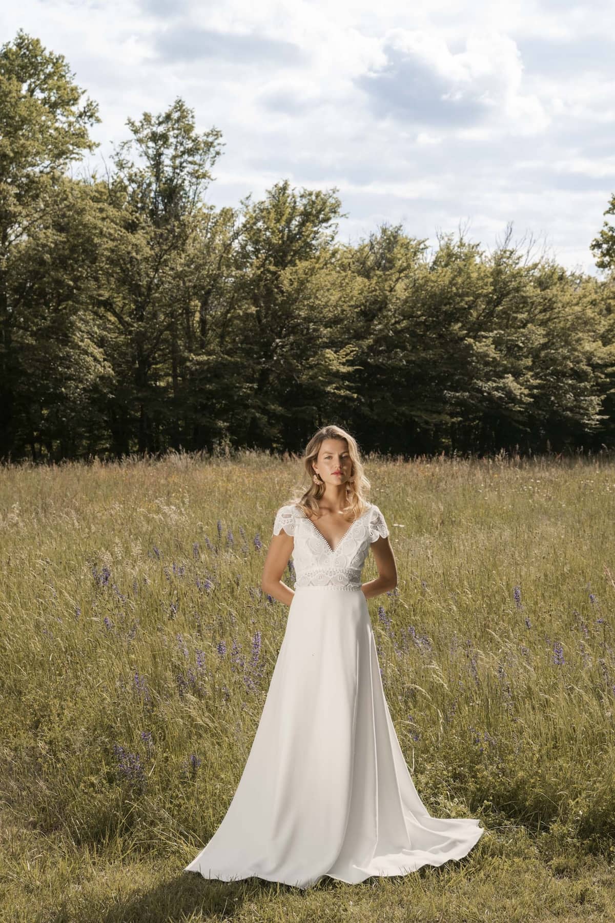 La robe Daphné est tout simplement superbe. Son joli décolleté en V, associé à une ceinture sous la poitrine, constitue la signature d’Elsa Gary. Elle a tous les atouts pour séduire : la jupe en crêpe grain offre une texture élégante, tandis que la quille en dentelle, assortie au buste, ajoute une touche de sophistication. Le petit galon raffiné complète le tout, faisant de cette robe un choix parfait pour toutes les occasions.