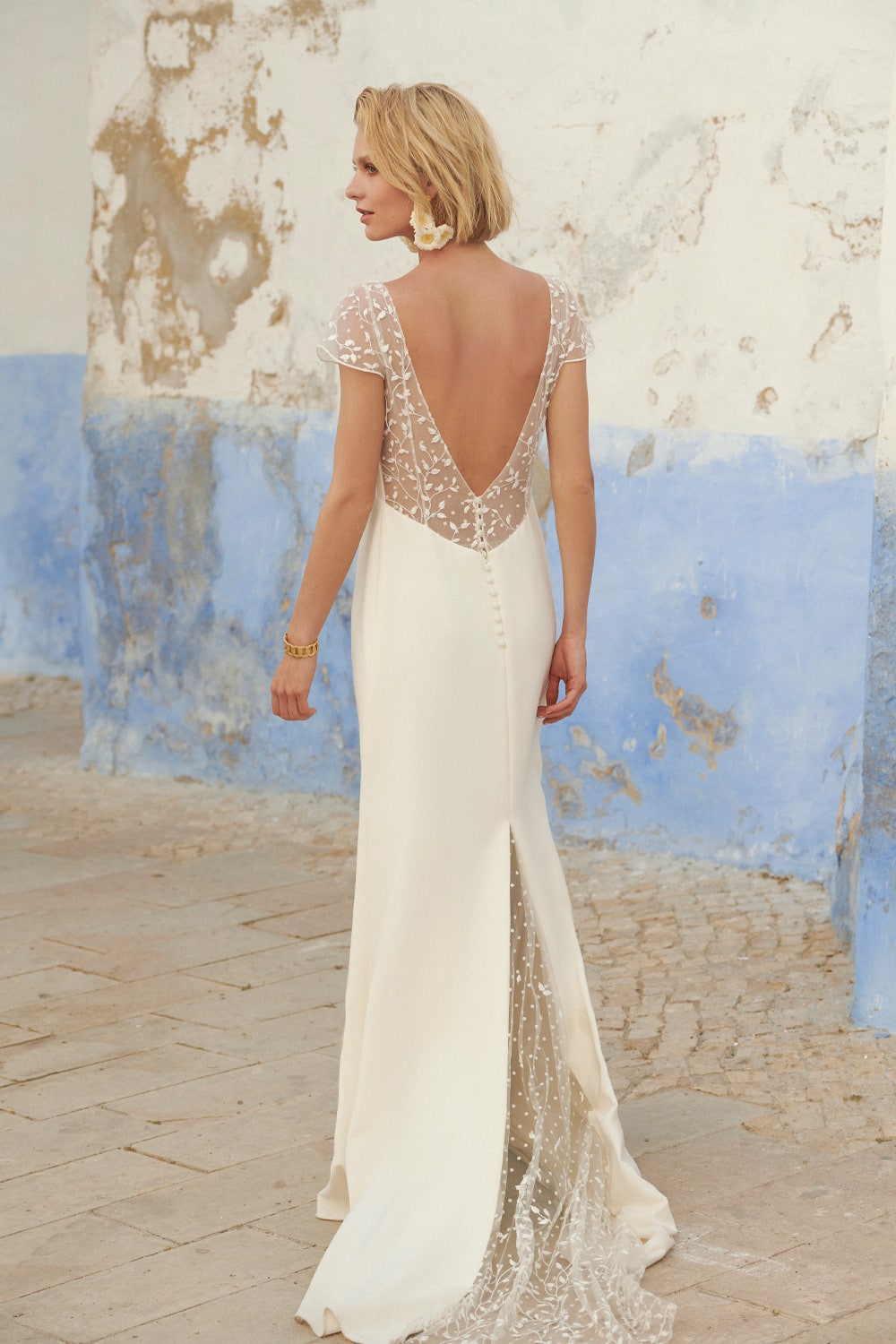 Le dos a également un décolleté en V recouvert de tulle brodé, de même pour les manches courtes. La jupe a une petite traîne.