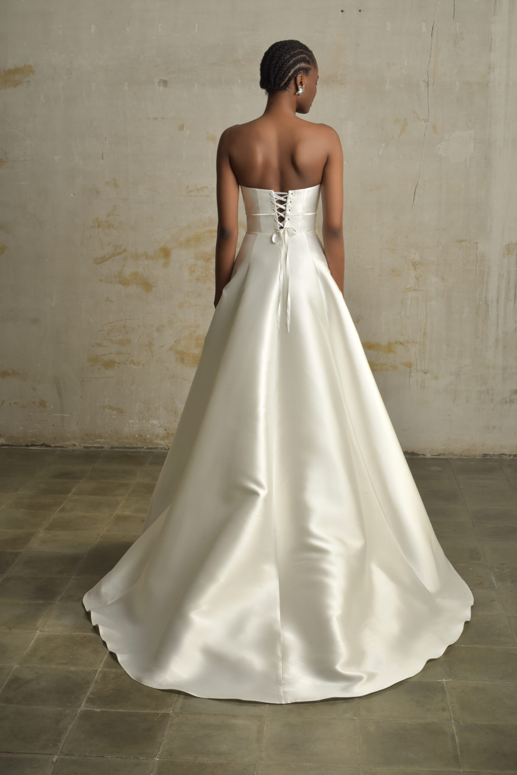 Réalisée en mikado de soie, réalisée en France, doublure satin de coton et soie.