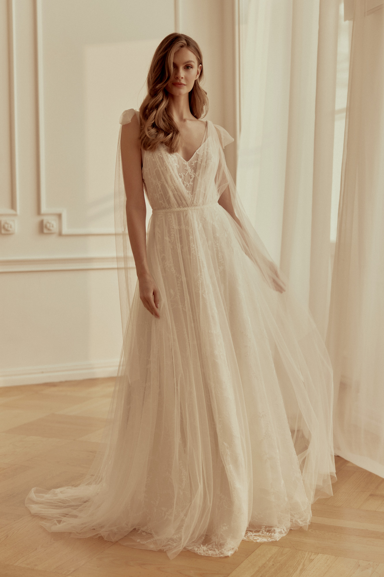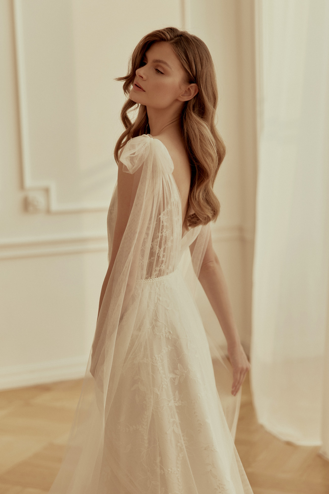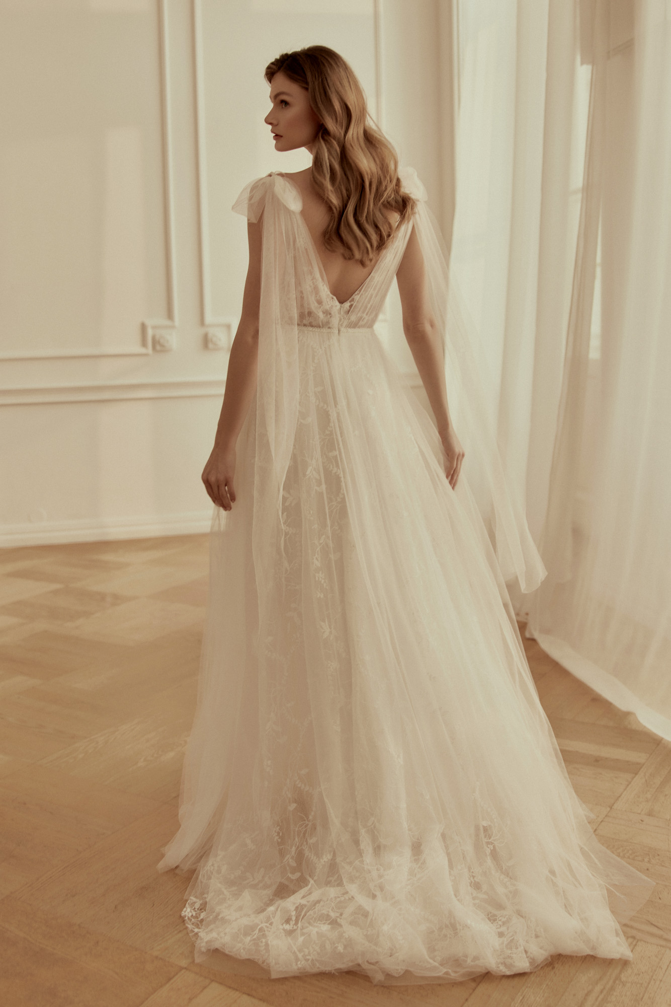 Conçue pour les romantiques dansant pieds nus sur l’herbe humide, cette robe est une composition légère de tulle doux et de dentelle française de coton. Son décolleté en V classique et son dos nu soulignent subtilement la féminité. Le drapé en tulle doux apporte une touche délicate et magique. Cerise sur le gâteau, des nœuds en tulle sur les épaules apportent une touche de magie à l’ensemble.