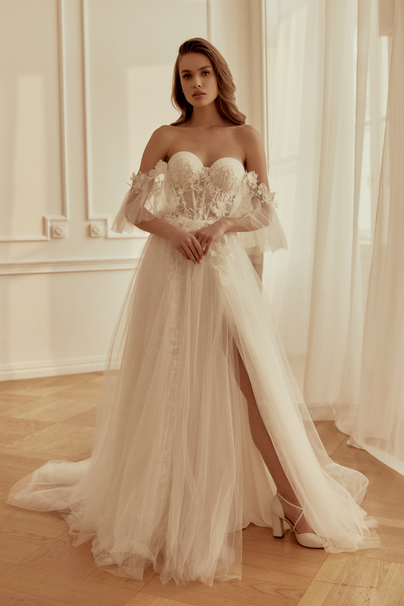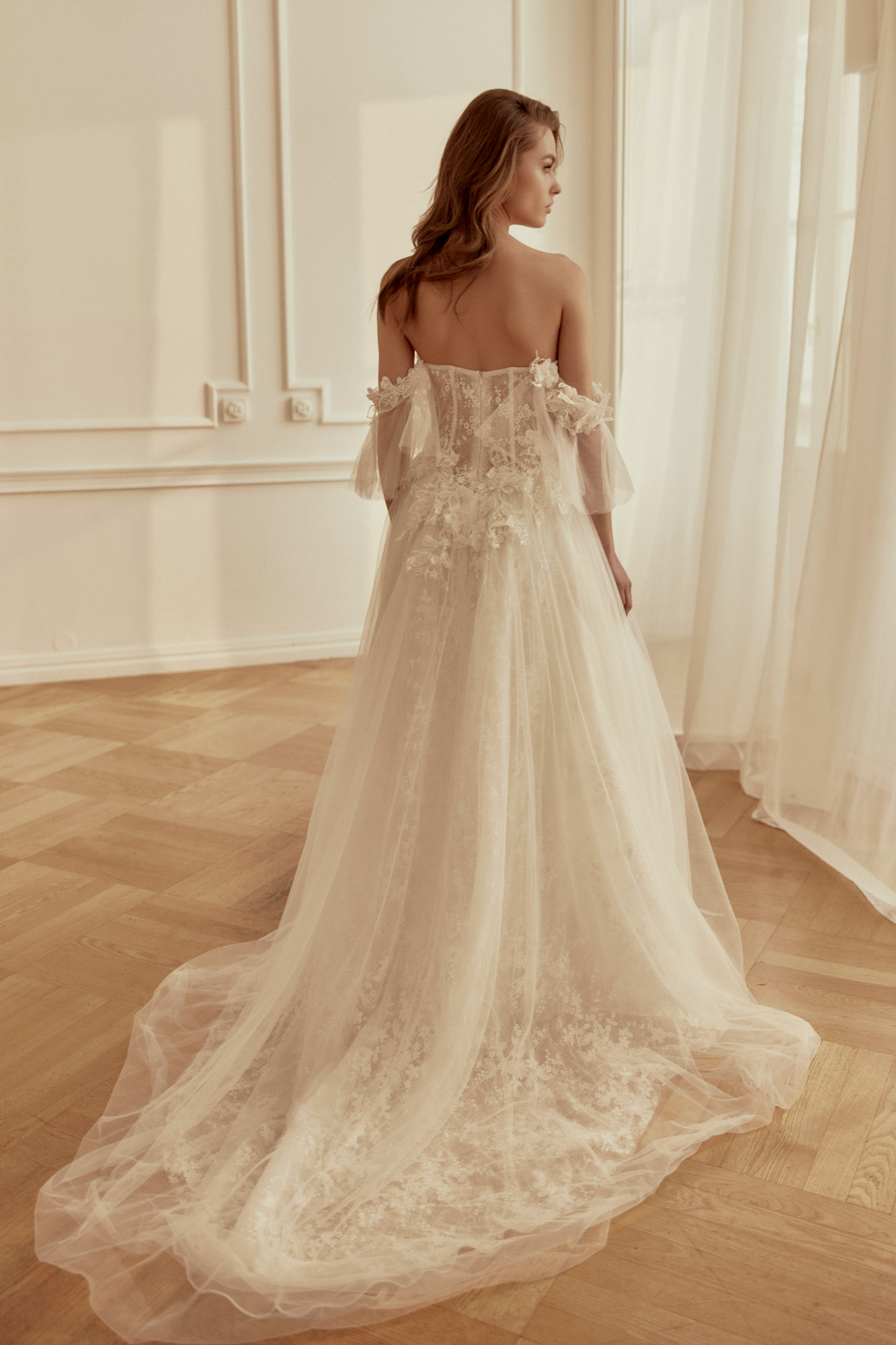 Robe de mariée longue, de coupe A-Line et style fluide, confectionnée en tulle.Le bustier est un corset rehaussé de dentelles. Elle est dotée d’un décolleté arrondi et d’un dos nu. Un modèle de rêve Mialavi.