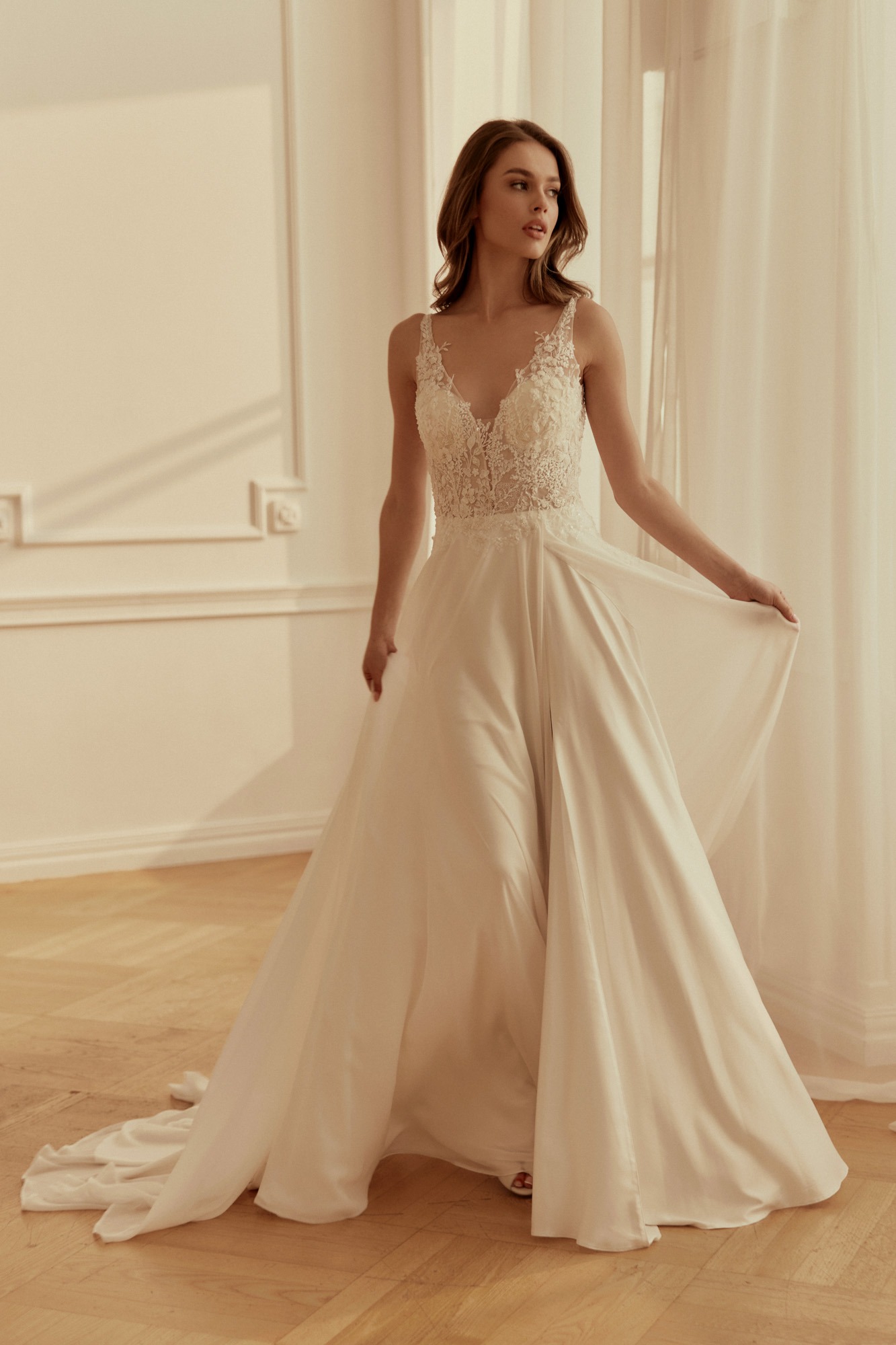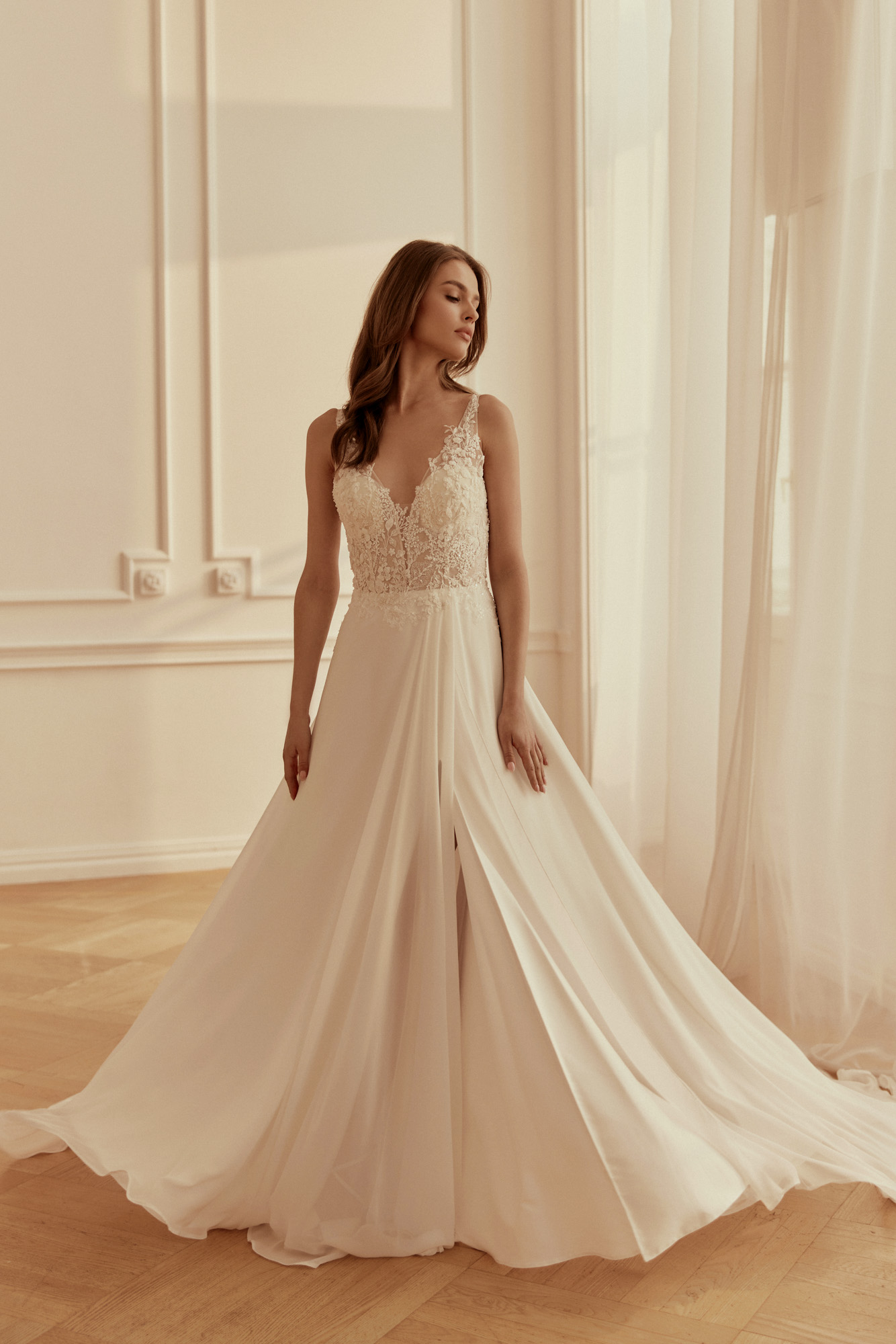 Robe de mariée longue, de coupe A-Line , style fluide, confectionnée en mousseline rehaussé de dentelle et de pierreries. Elle est dotée d’un décolleté profond et un dos nu. Un modèle de rêve Mialavi .