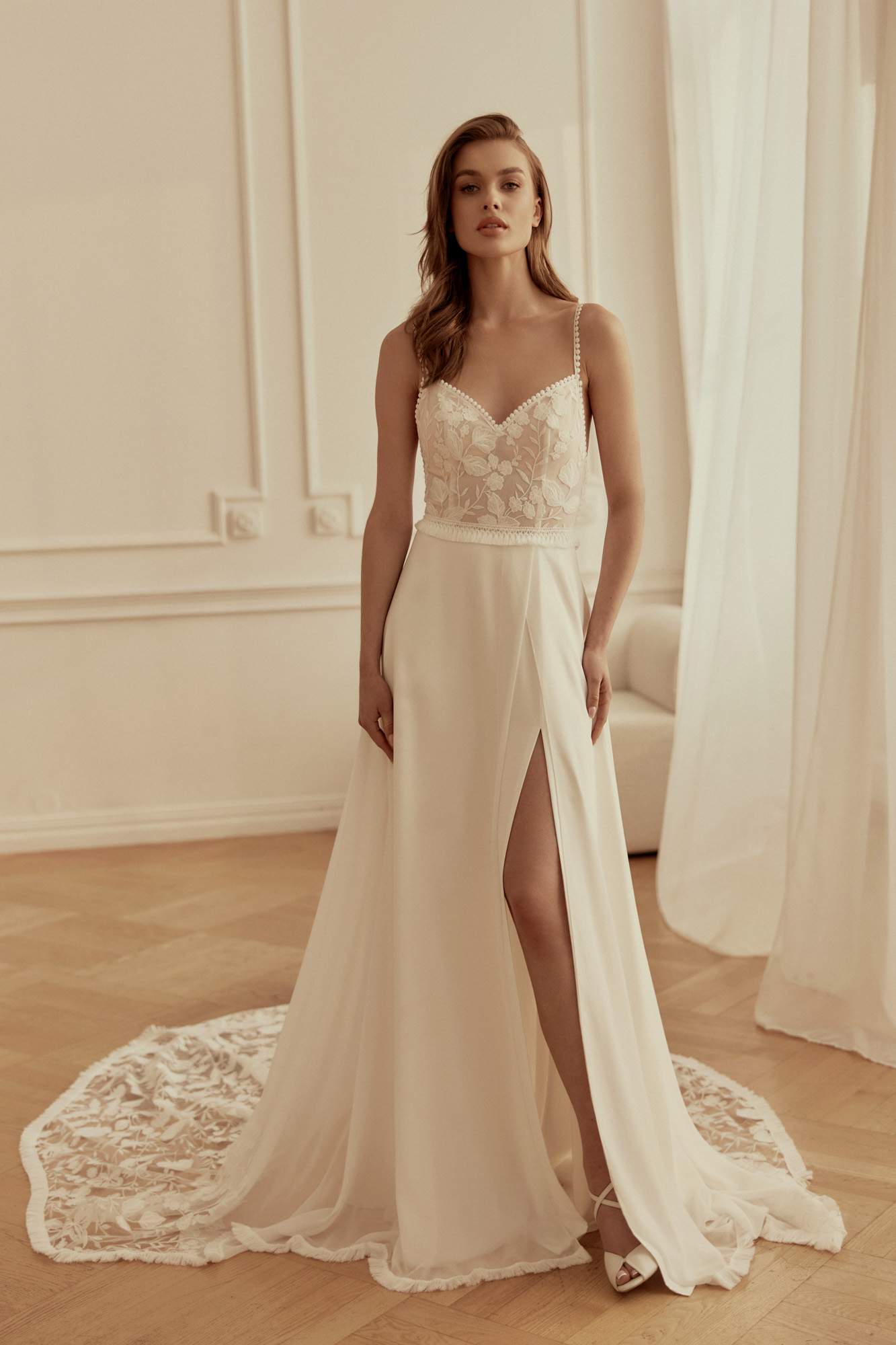 Une robe longue et délicate de style bohème. Le corsage est en dentelle ornée de fines bretelles à bordures bouffantes. Le dos est orné de boutons et d’une taille frangée. La longue jupe en mousseline est fendue et dotée d’une traîne.