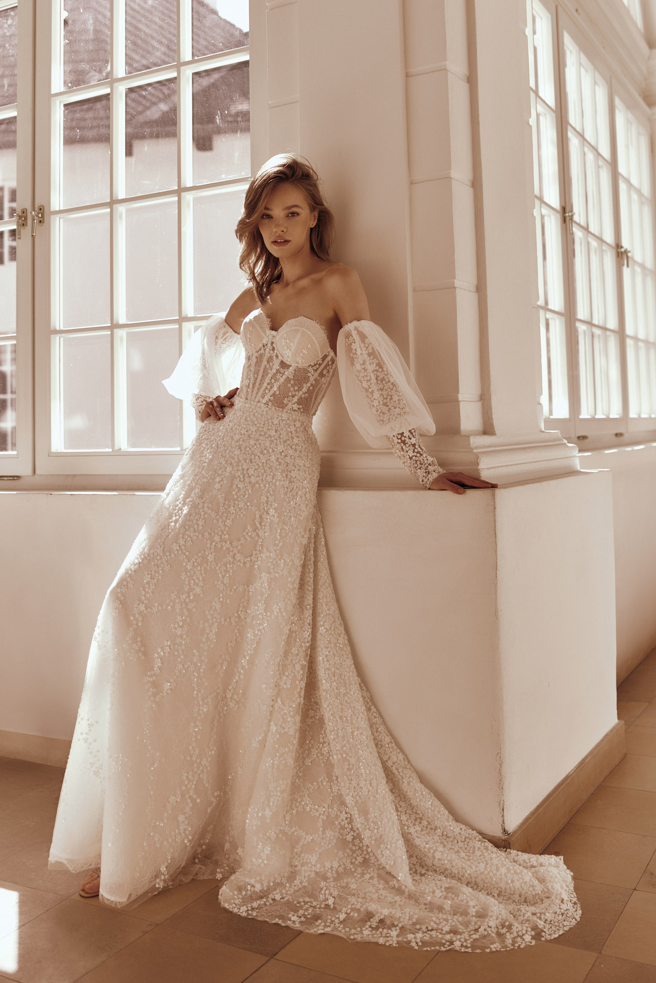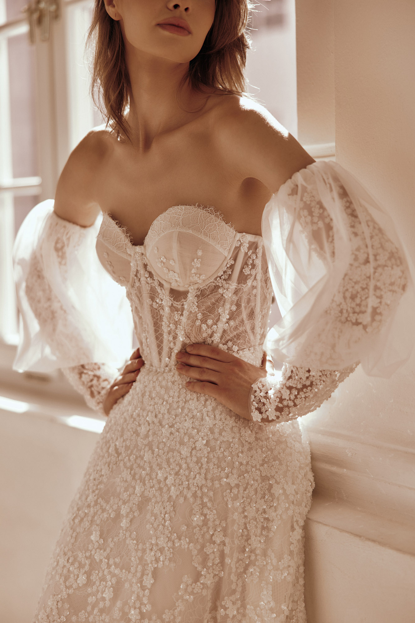 Une robe de bal moderne avec un corsage en lin composé de deux éléments en dentelle, créant un ensemble cohérent et subtil. Des manches en dentelle et un léger bouffant en tulle complètent le look.