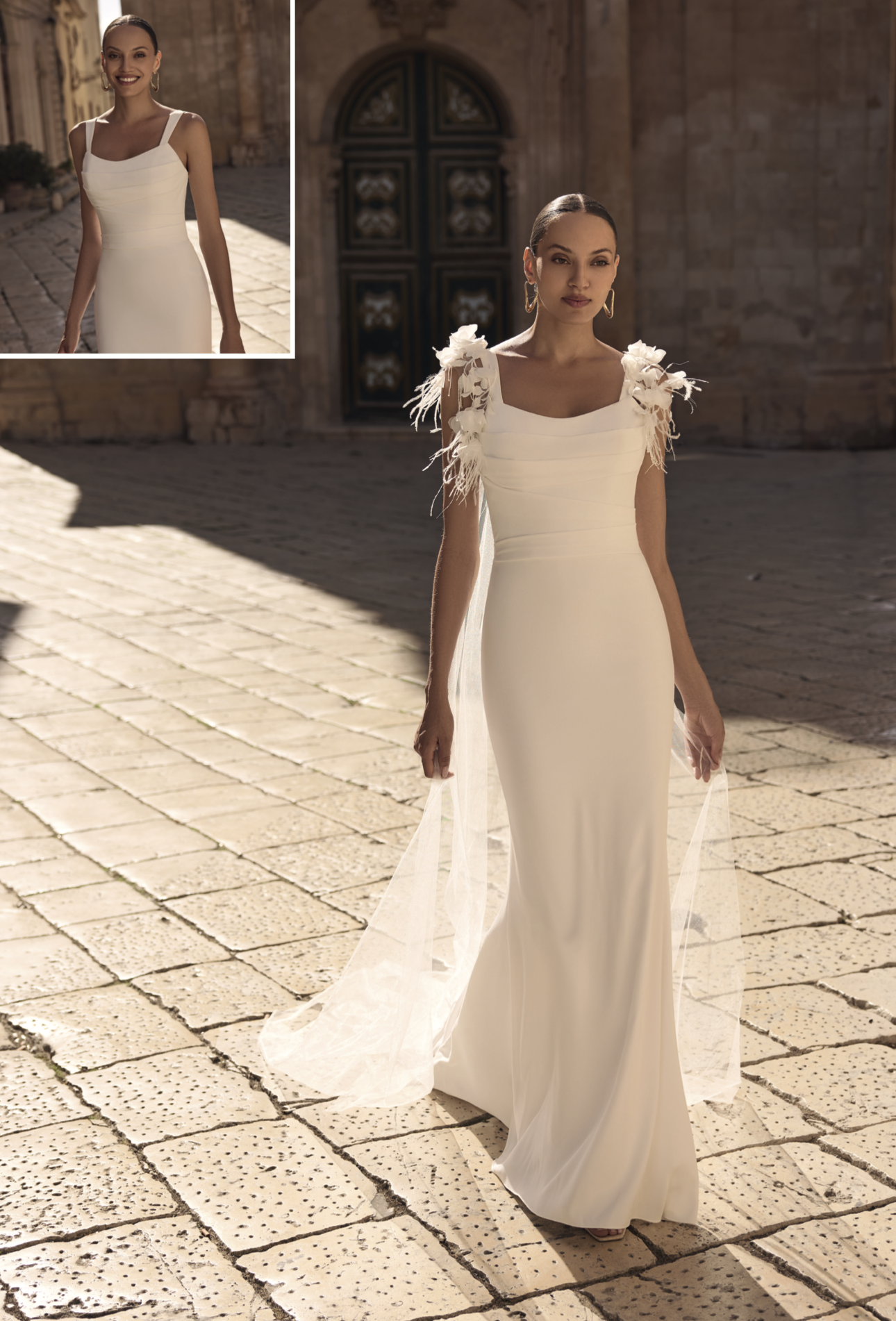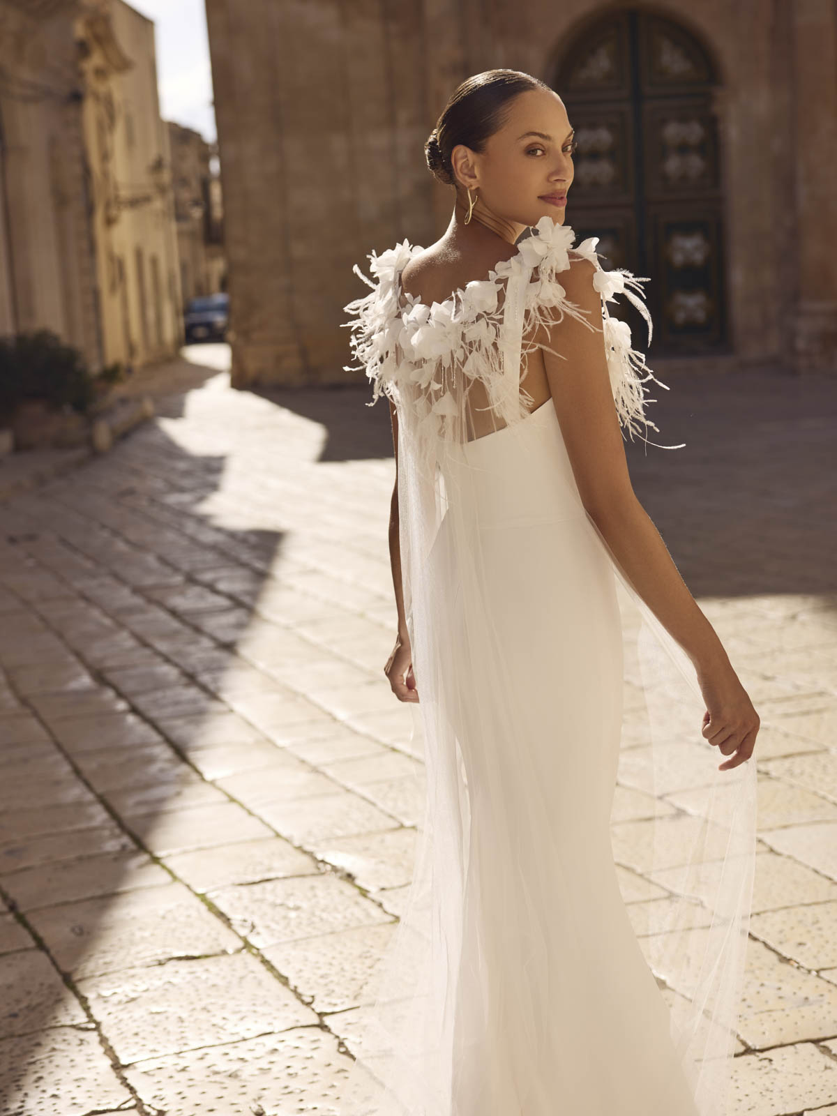 Sentez-vous sublime pour votre grand jour dans la magnifique robe Gaura, un parfait mélange de sophistication et de romantisme. Cette robe ajustée et évasée, confectionnée en crêpe luxueux, présente un corsage magnifiquement drapé qui sublime vos formes. La cape amovible en tulle ornée de délicats pétales de fleurs apporte une touche à la fois spectaculaire et féminine, créant une allure inoubliable pour votre mariage. Pour un style plus épuré, la Gaura-D est disponible sans cape, tandis que la cape peut également être achetée séparément sous le nom de Gaura-FL pour les mariées souhaitant ajouter une touche de magie supplémentaire à leur tenue.