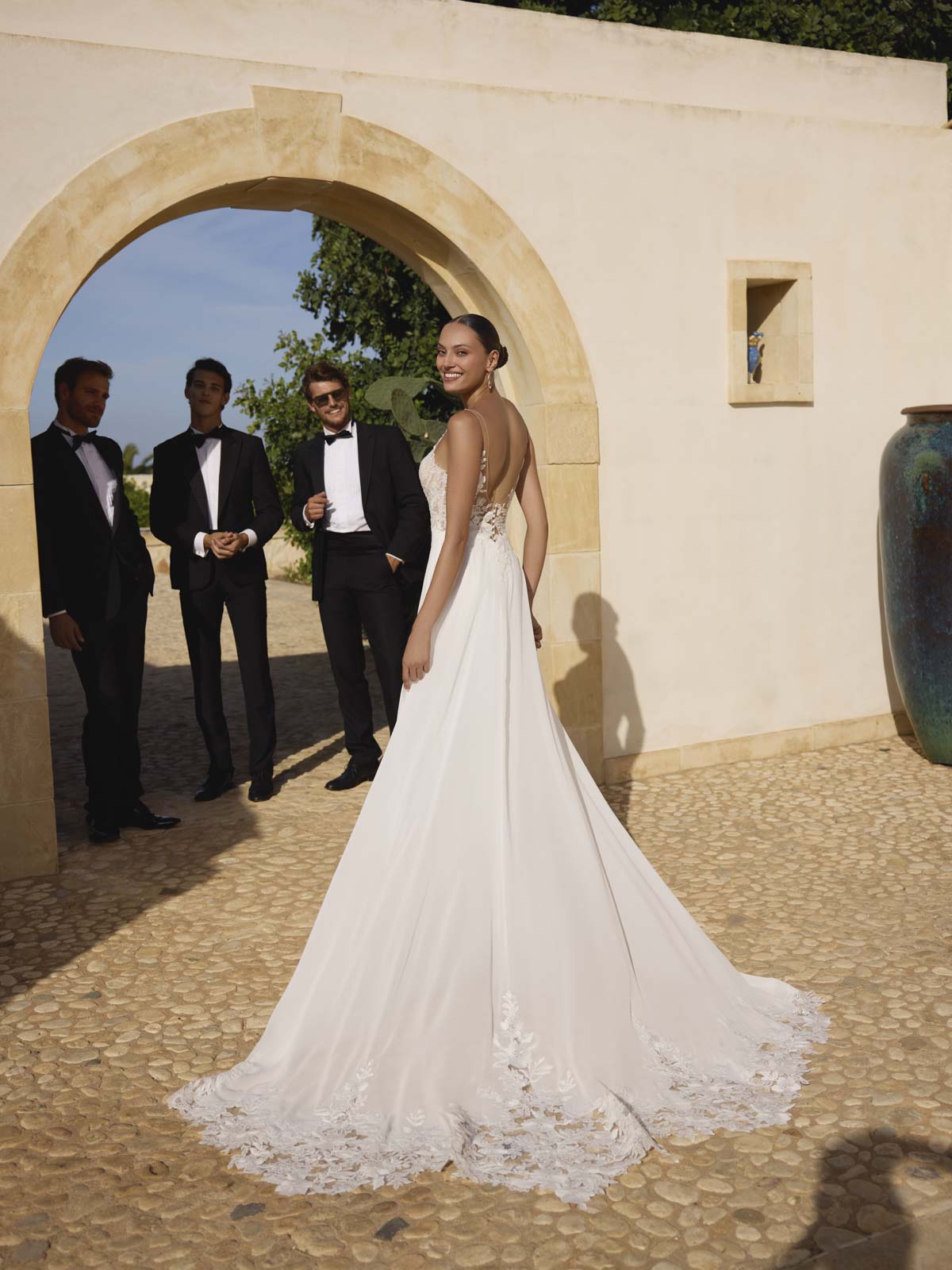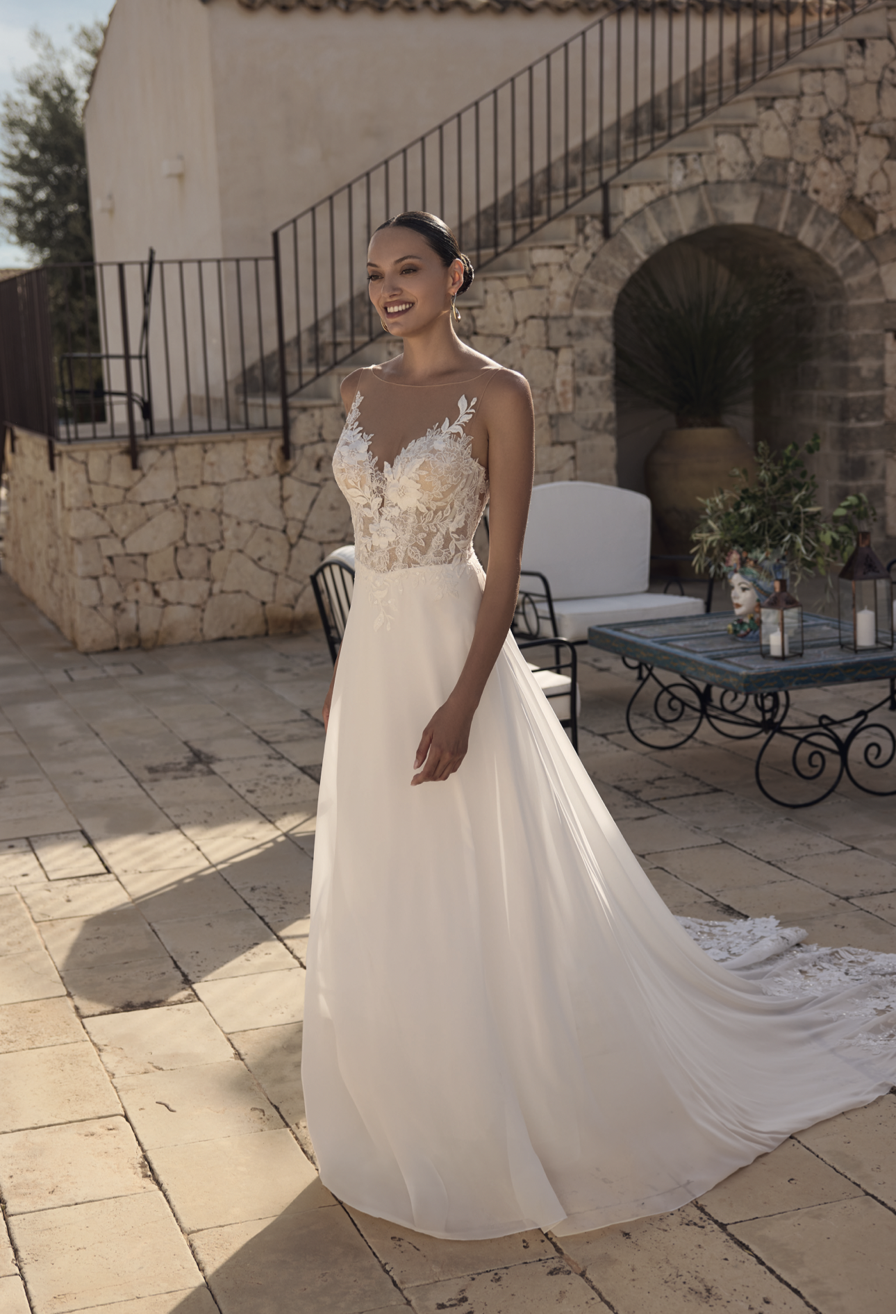 La robe Ginette est une robe trapèze intemporelle, dotée d’un corsage en dentelle illusion et d’un décolleté en cœur, offrant une touche délicate et féminine. La jupe fluide en mousseline drape magnifiquement, créant une silhouette douce et aérienne. Une magnifique traîne ornée de dentelle apporte une touche romantique et élégante. Cette robe est également disponible avec une traîne unie, sous le nom de Ginette-A.