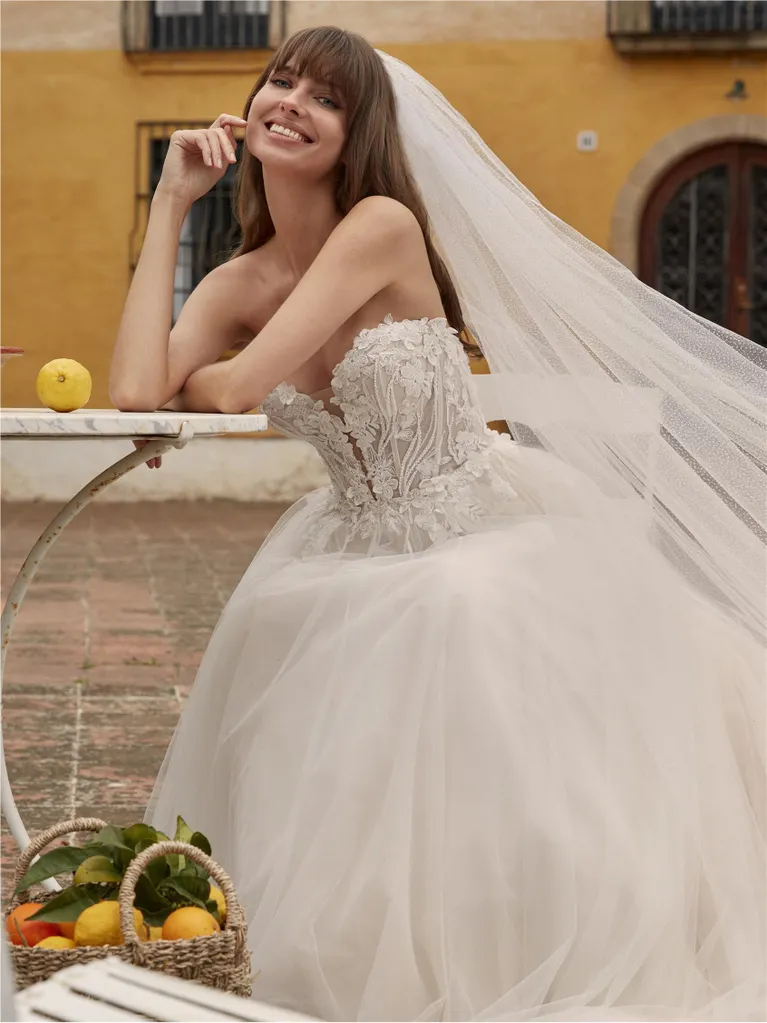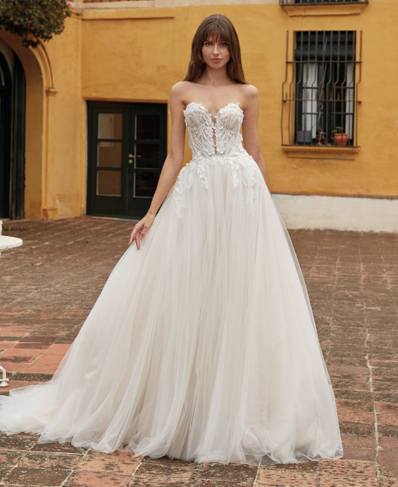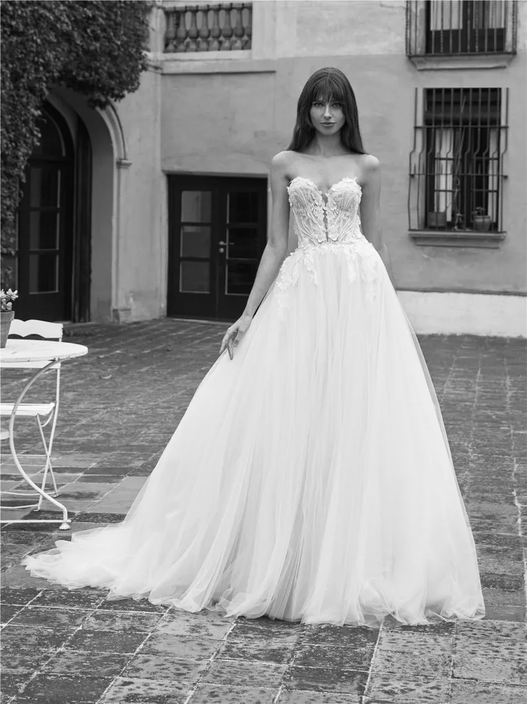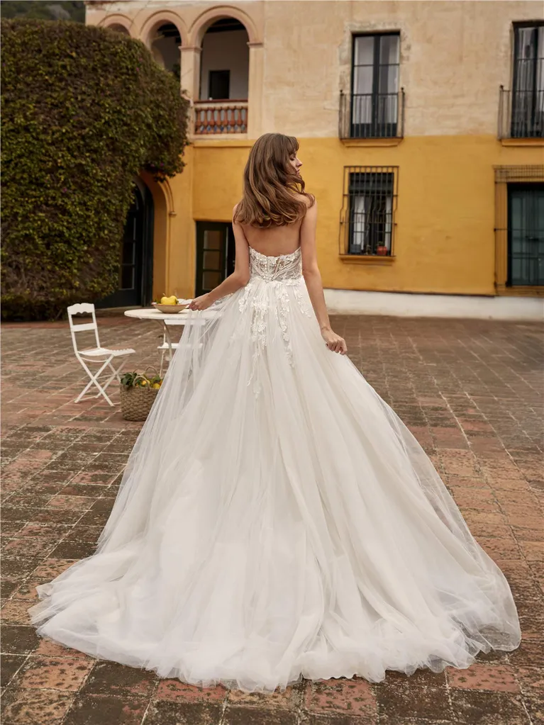 Avec une silhouette princesse et un mélange de tulle et de dentelle, cette robe célèbre le romantisme avec une touche majestueuse. Le décolleté en cœur et le dos ouvert équilibrent le volume avec une sensualité discrète.