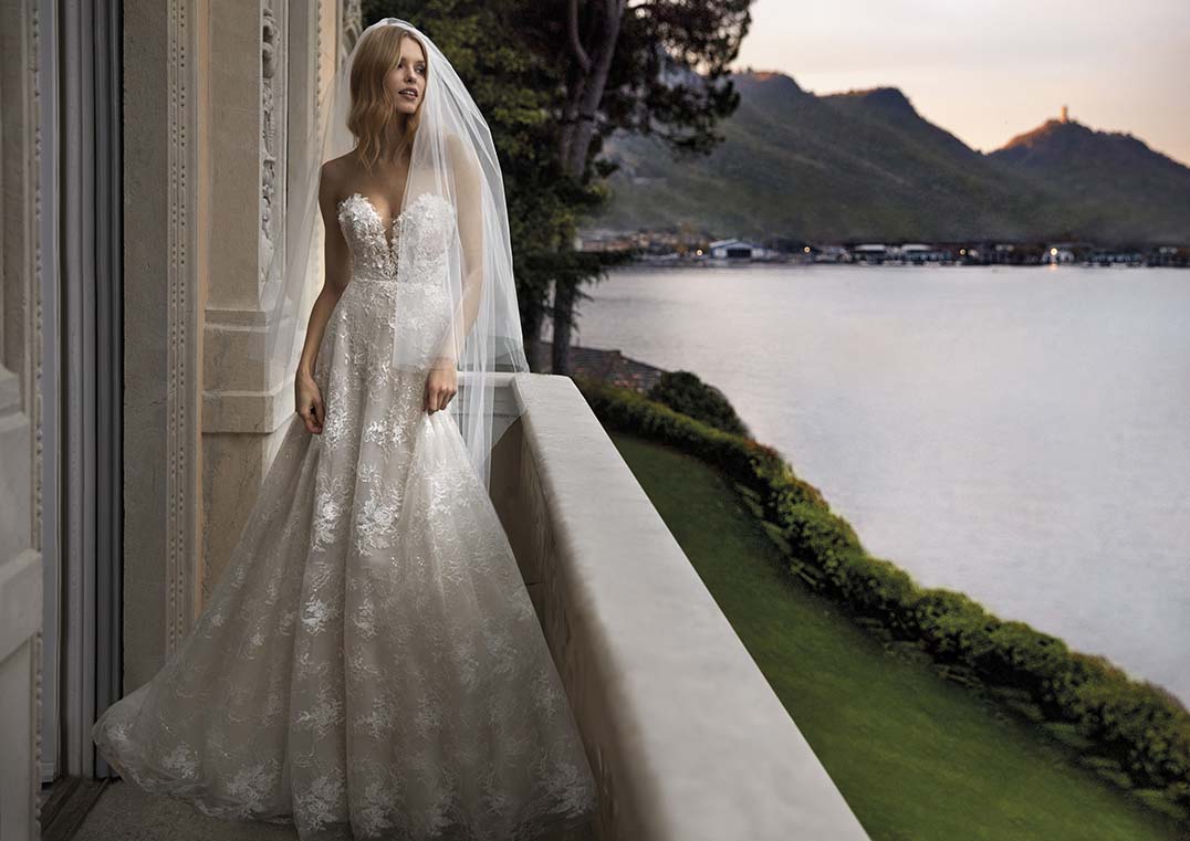 Une robe qui est compsée exclusivement de dentelles fine. Le décolleté bustier et le dos ouvert révèlent une féminité sophistiquée, parfaite pour une entrée inoubliable.