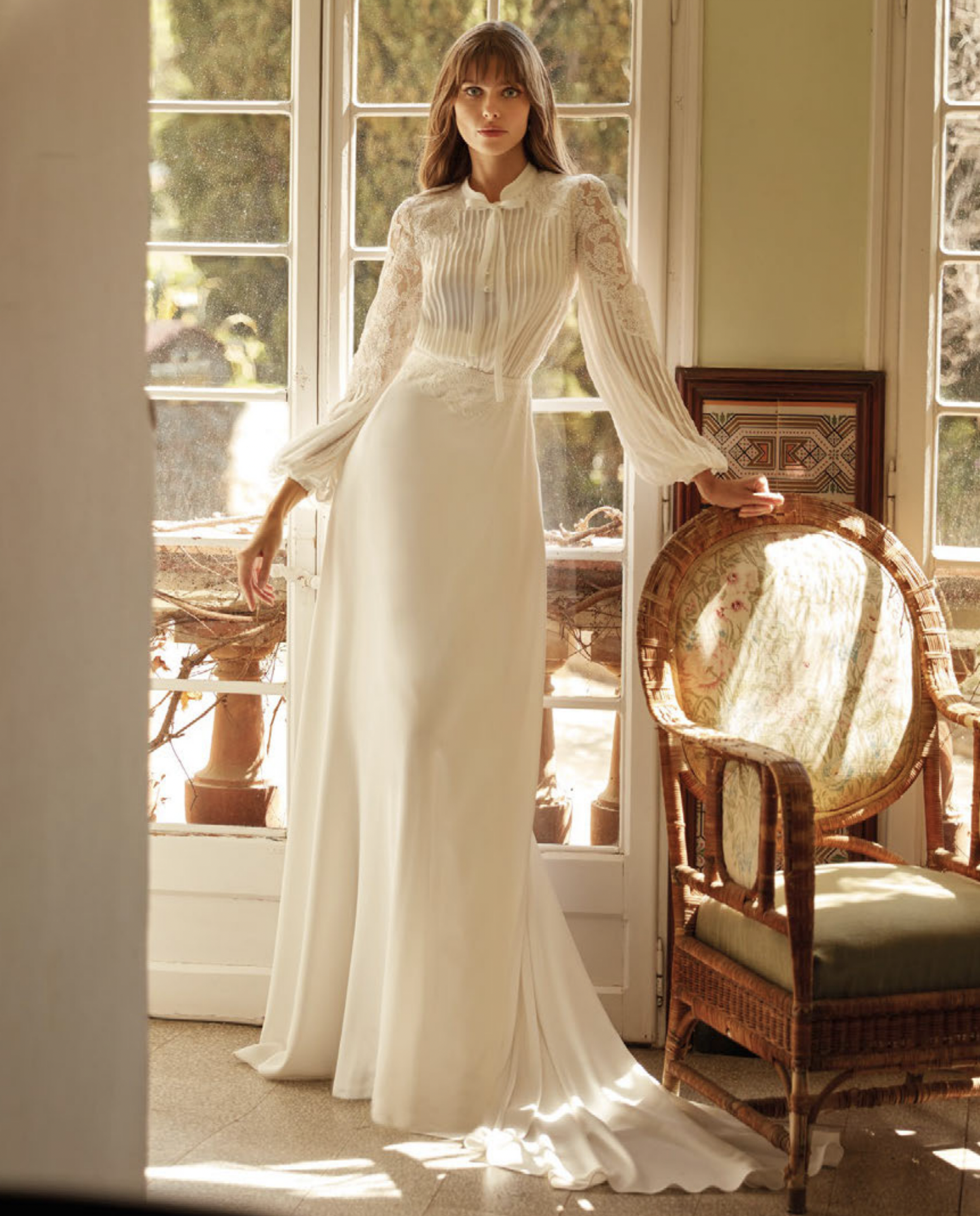 Une robe forme A-Line en mousseline de soie. Le chemisier en mousseline et dentelle révèle une féminité sophistiquée, parfaite pour une entrée inoubliable.