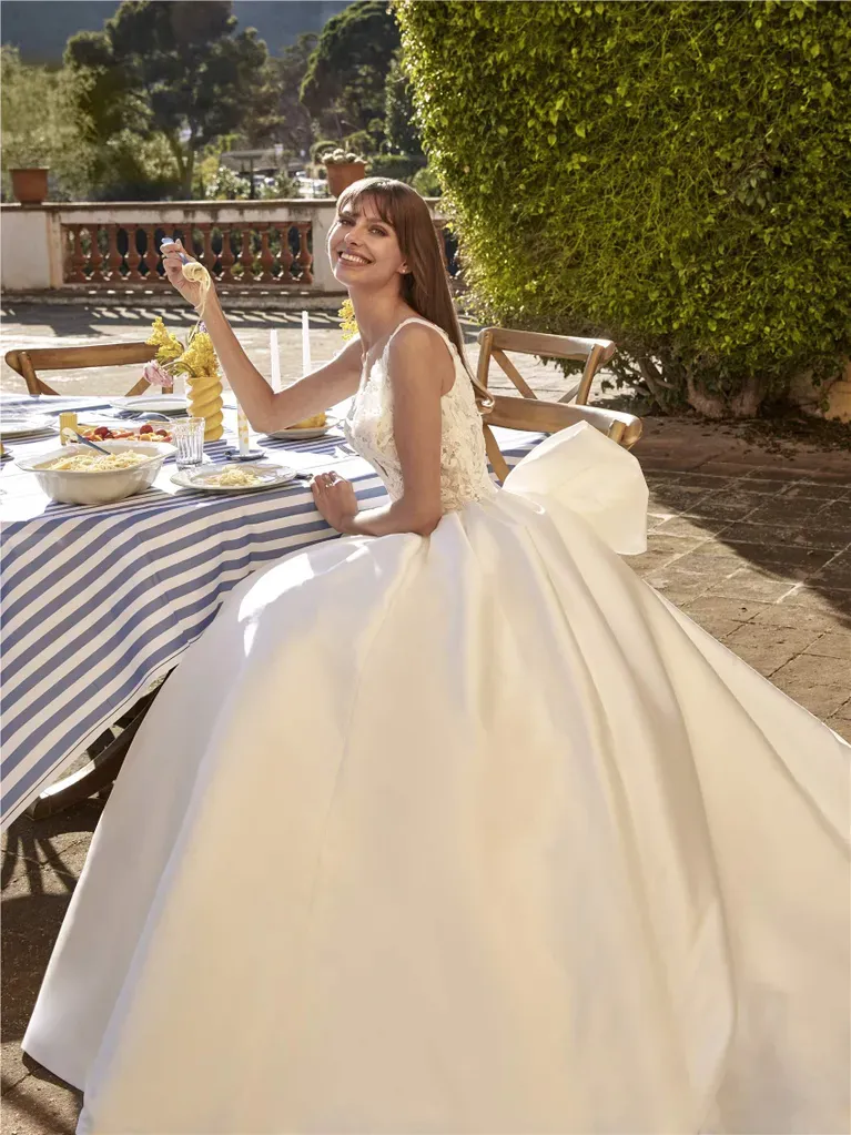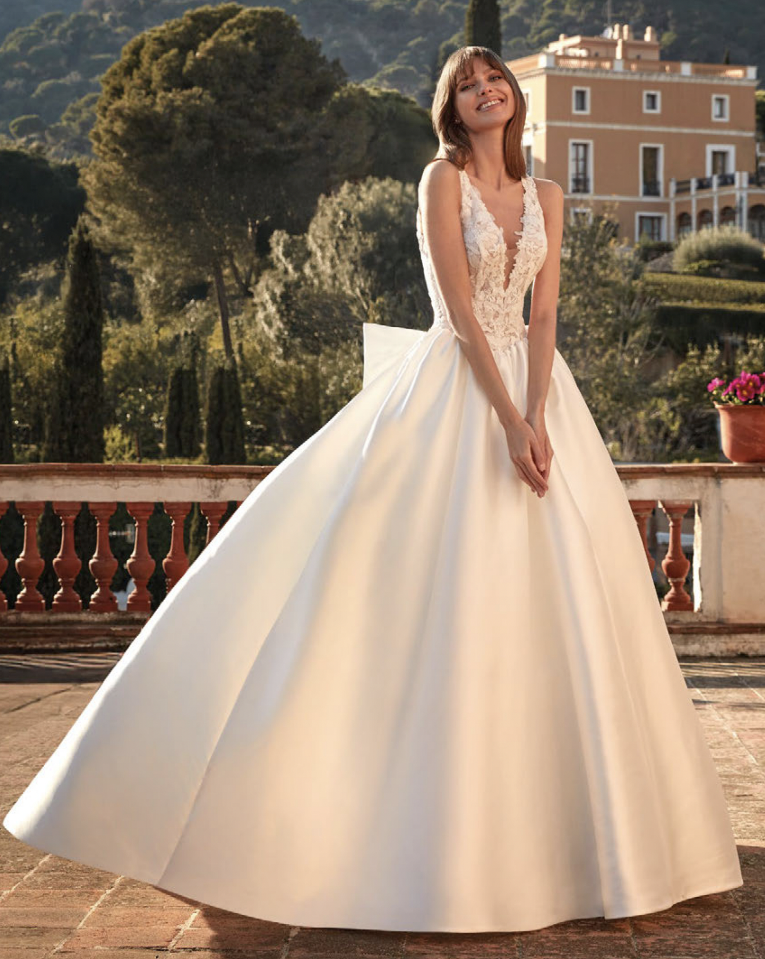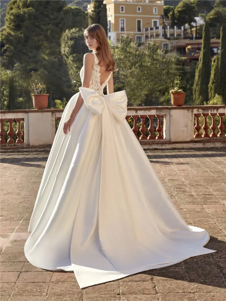 Une robe qui associe la texture du mikado à l’éclat subtil des perles. Le décolleté profond et le dos ouvert et son noeud révèlent une féminité sophistiquée, parfaite pour une entrée inoubliable.