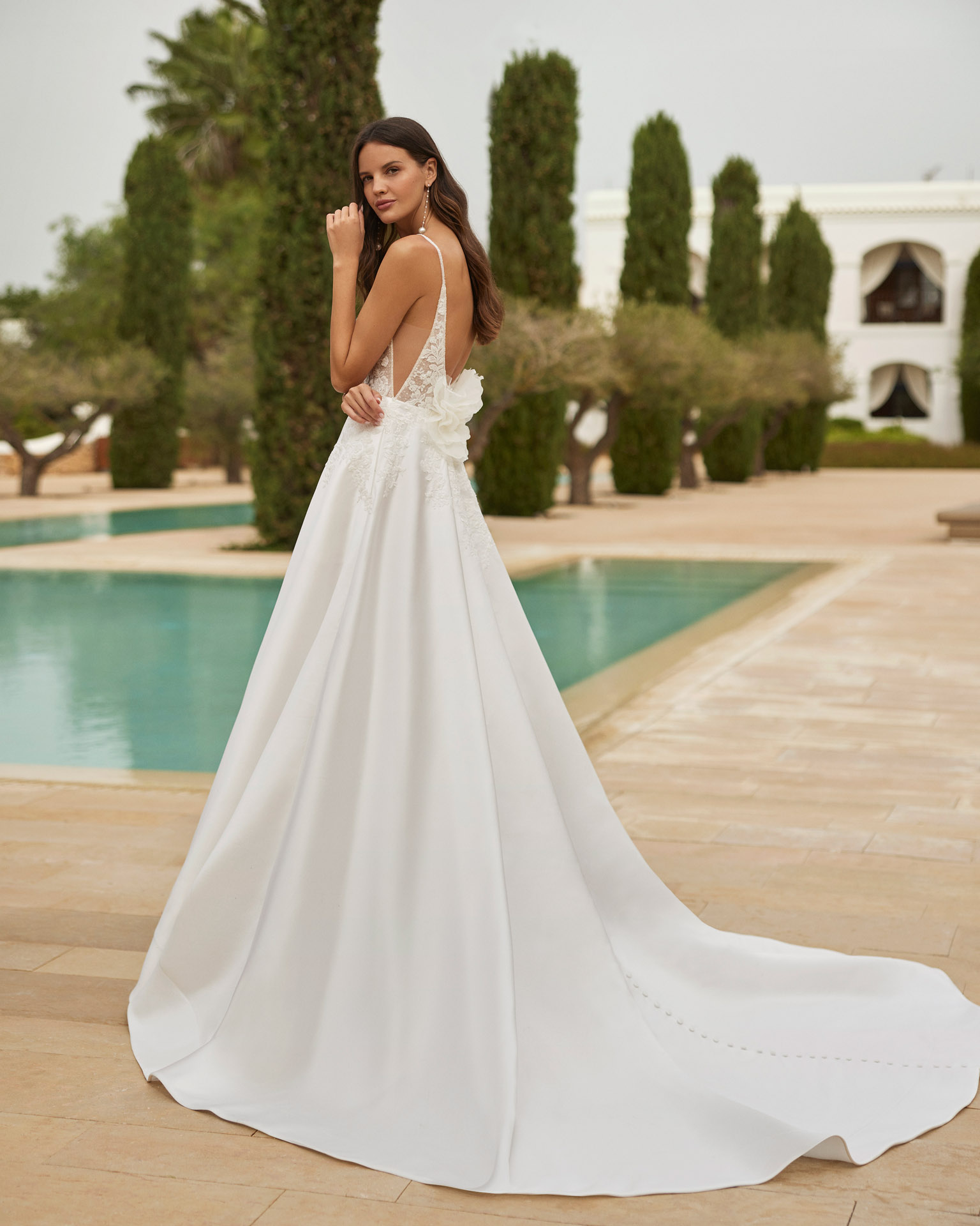 Robe de mariée longue coupe A en satin avec corsage en dentelle, perles, décolleté profond, bretelles perlées, dos ouvert et jupe fendue sur le devant.