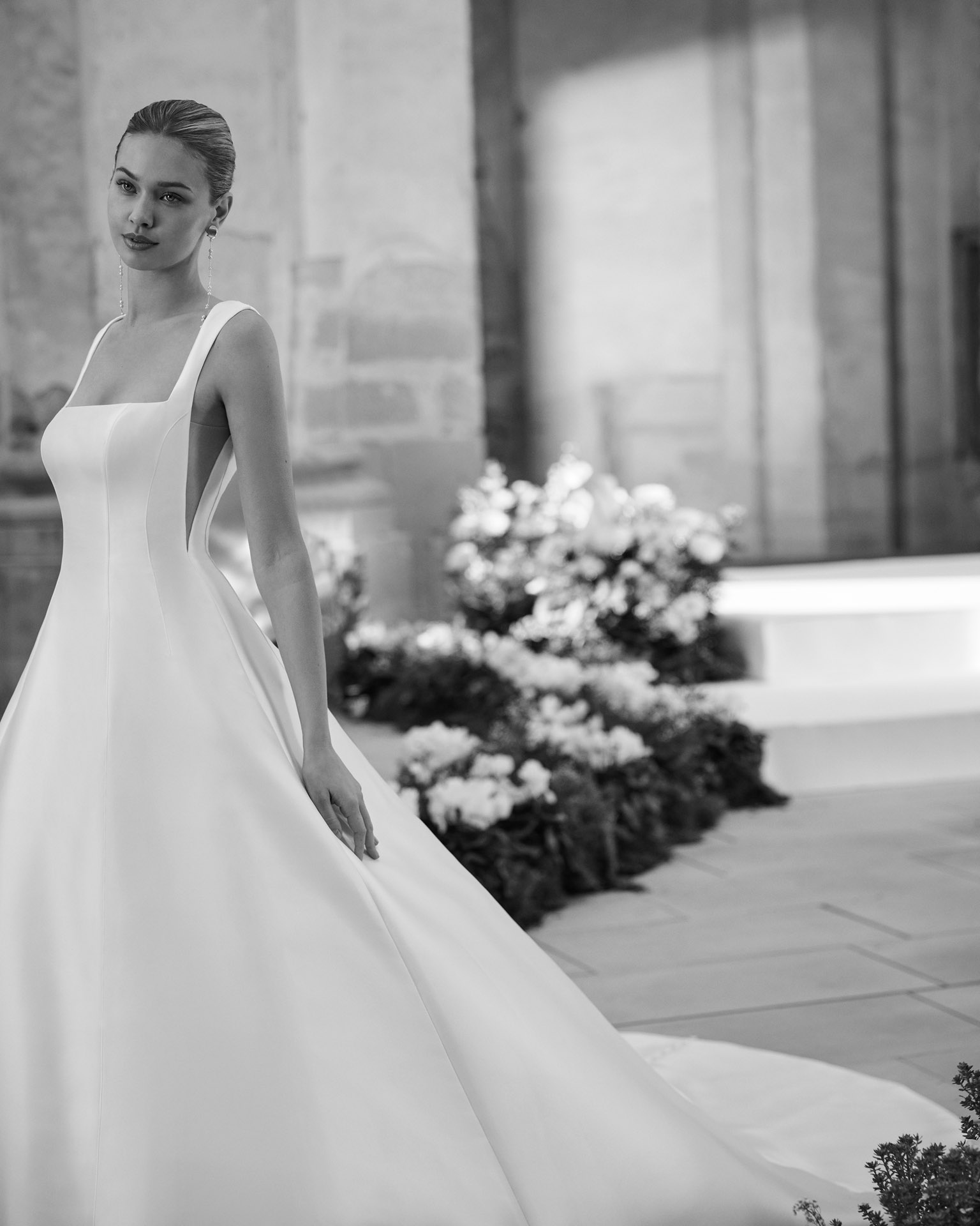 Robe de mariée, silhouette volumineuse. En mikado. Décolleté carré, bretelles et dos en V.