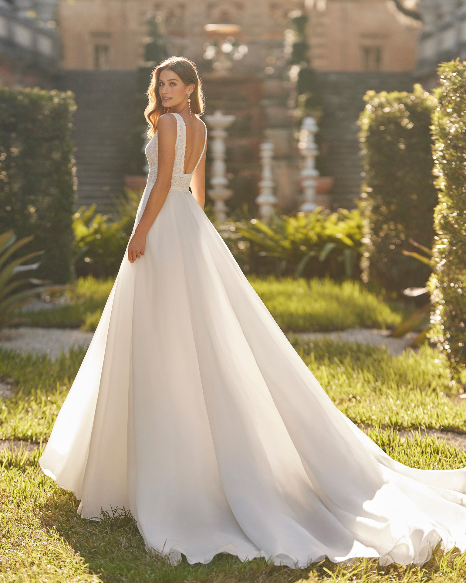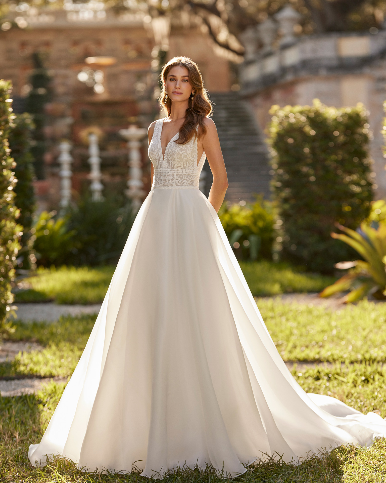 Robe de mariée de coupe princesse et style romantique, réalisée en gazar rehaussé de dentelles et de pierreries. Le modèle se termine par un décolleté plongeant et un dos nu. Elle se distingue par ce look tendance Aire Barcelona.