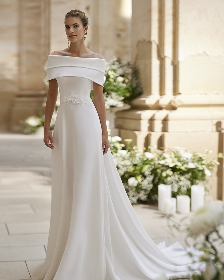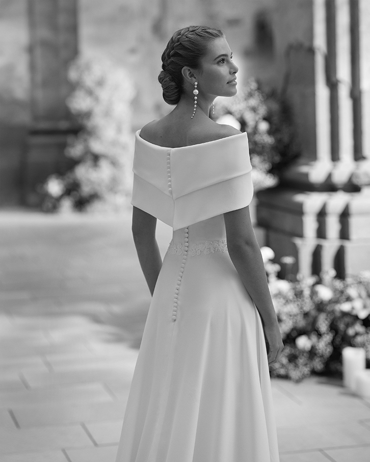 Robe de mariée princesse deux pièces, coupe trapèze, confectionnée en crêpe extensible. Son bustier est sublimé par un décolleté à poignets amovibles en crêpe. Une création Alma Novia de rêve.