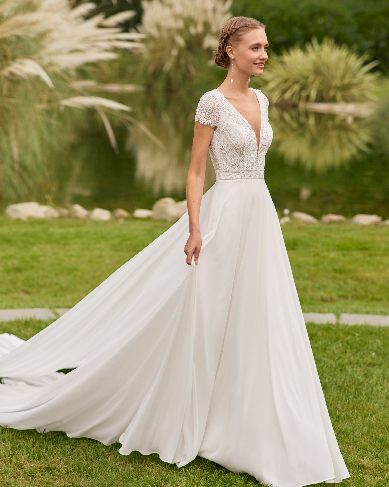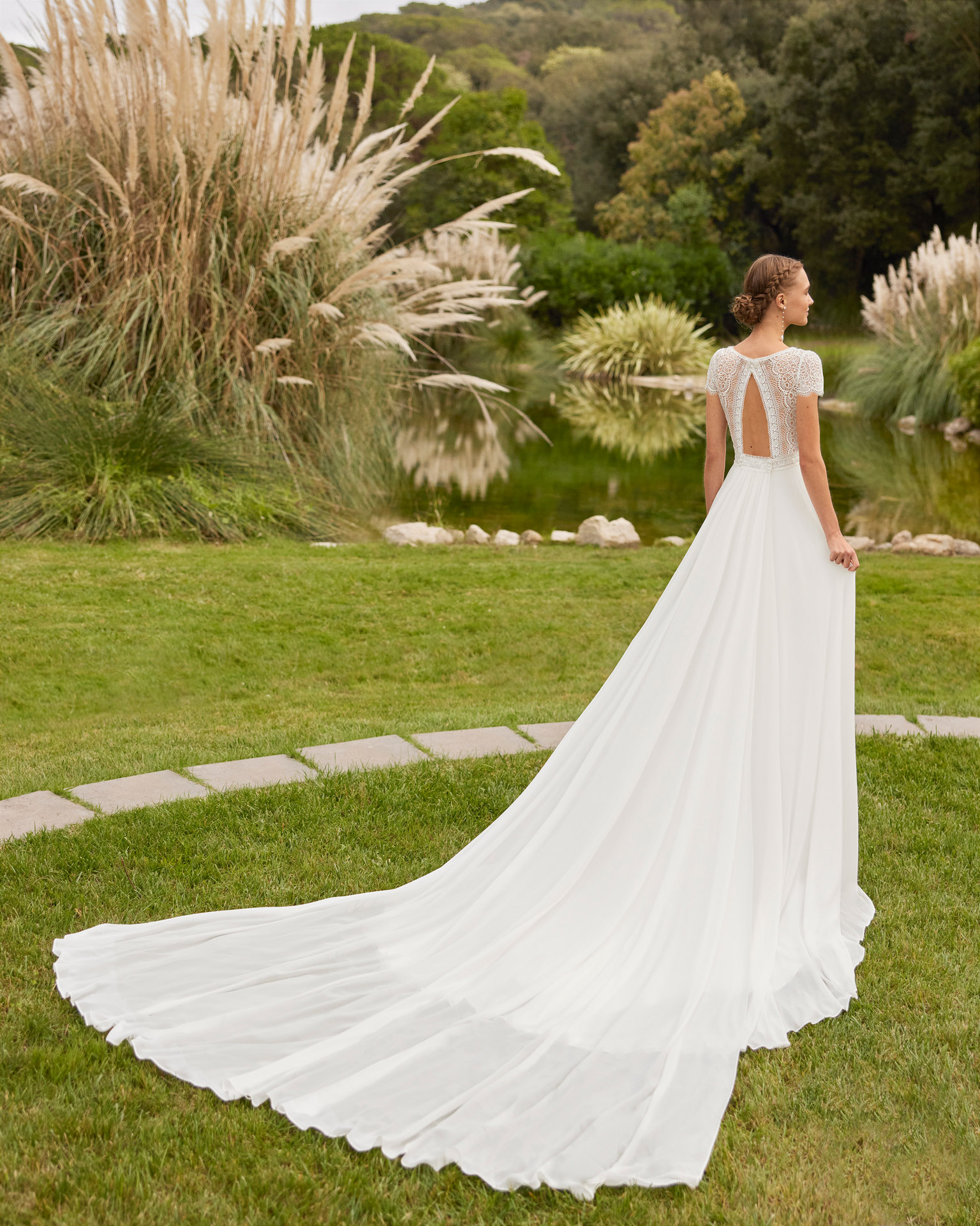 Robe de mariée longue, deux pièces, coupe droite. Confectionnée en crêpe avec ornements floraux, elle présente un décolleté dos nu et un dos nu avec traîne.