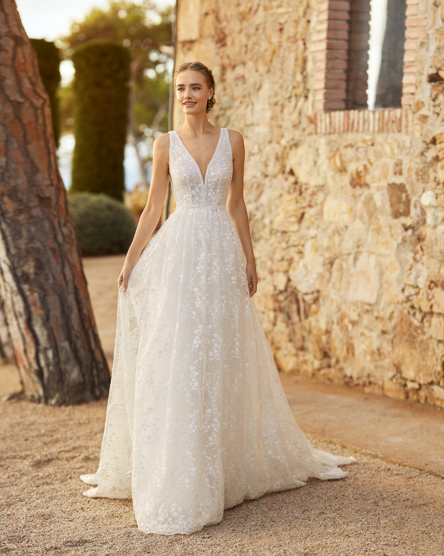 Robe de mariée , coupe trapèze, confectionnée en dentelle . Ce modèle Alma Novia de rêve présente un décolleté en V, un dos également en v.
