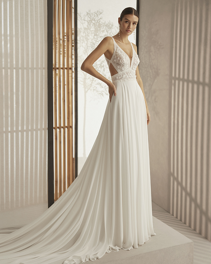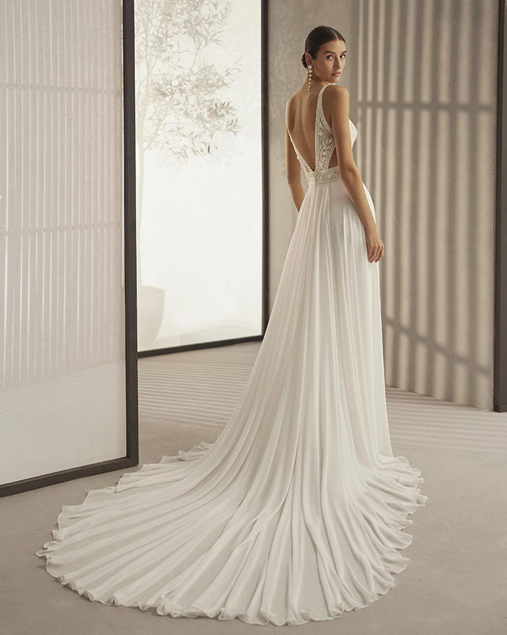 Robe de mariée de coupe droite au style fluide. Confectionnée en crêpe georgette et en dentelle ornée de pierreries. Avec col en V et dos nu. Avec cape en sus et ornement cut-out. Modèle Rosa Clará Soft.