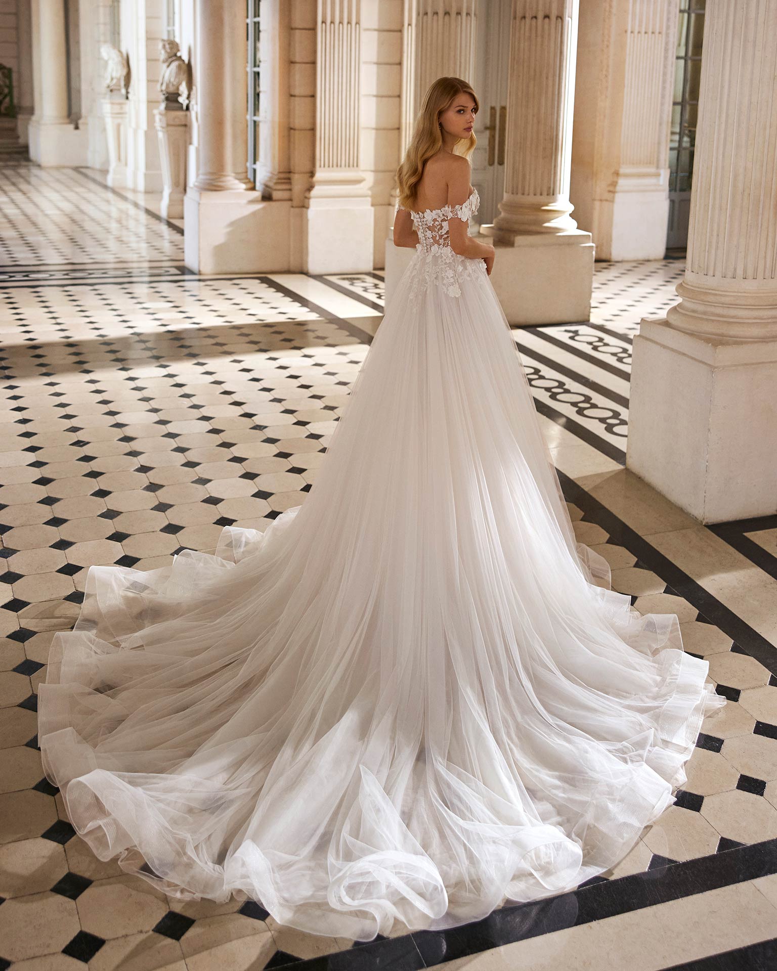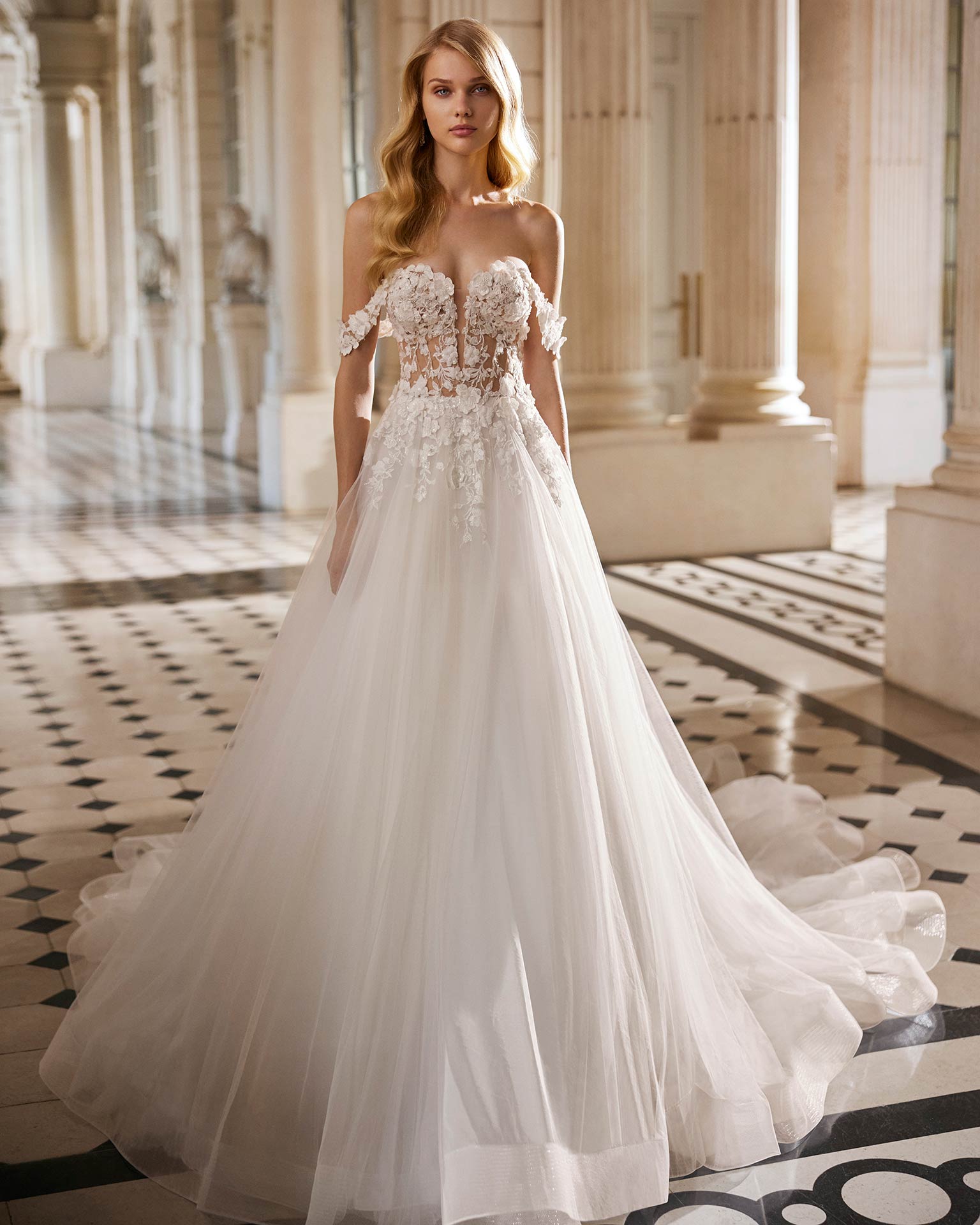 Robe de mariée, longue, de coupe A-line et au style romantique, avec un corsage en dentelle et une jupe en tulle. Son décolleté plongeant, son dos orné de boutons et ses bretelles tombantes lui confèrent une allure resplendissante. Un modèle Rosa Clará Dreams.