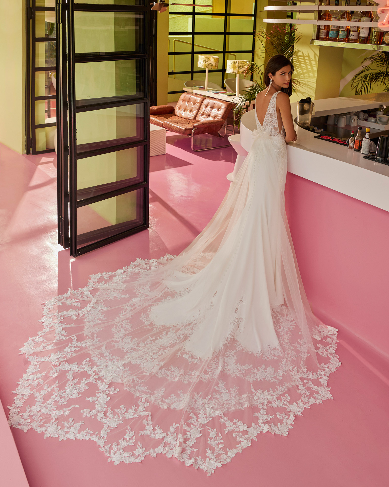 Robe de mariée longue deux pièces coupe trapèze. Crêpe extensible, décolleté en V, dos en V et traîne.