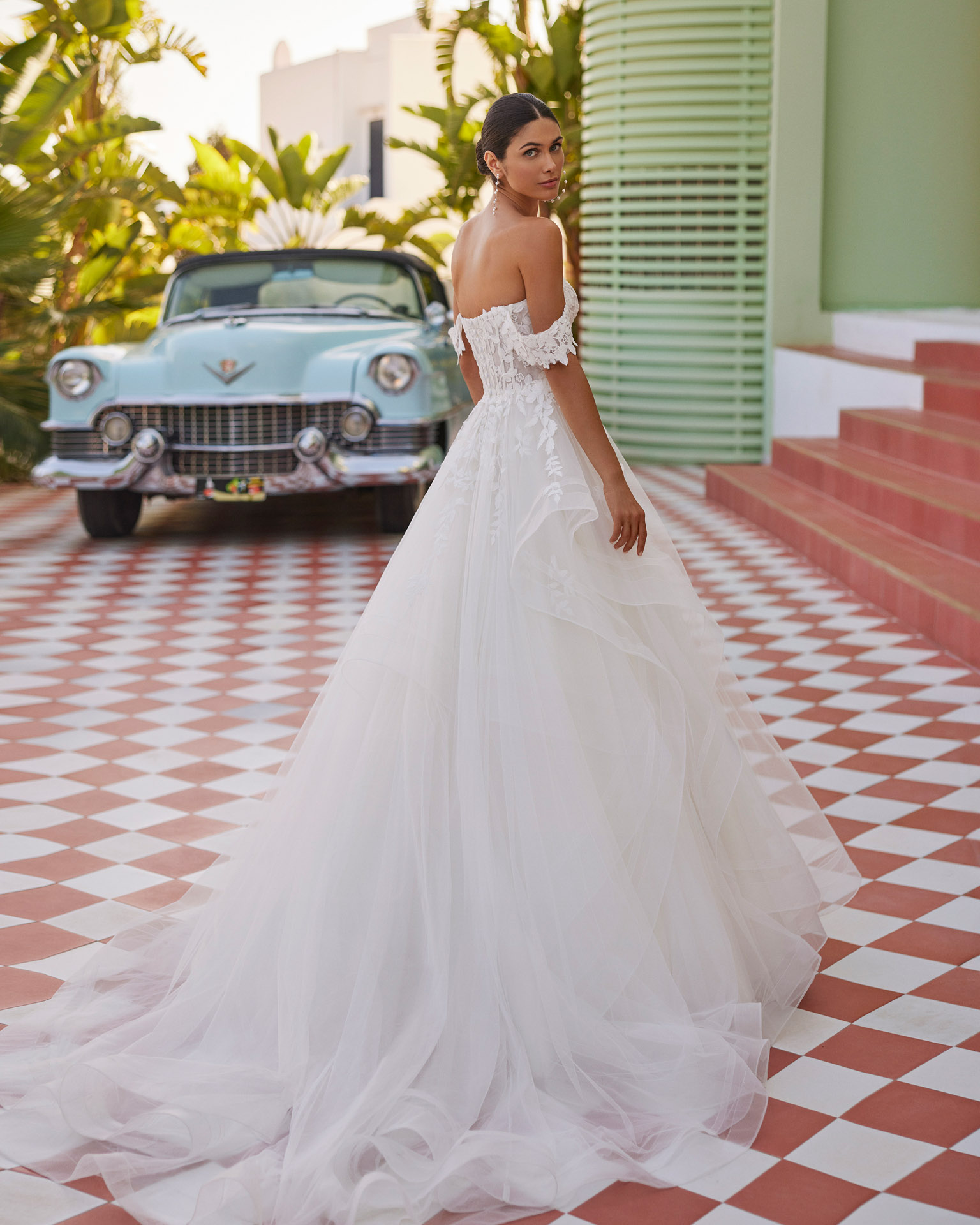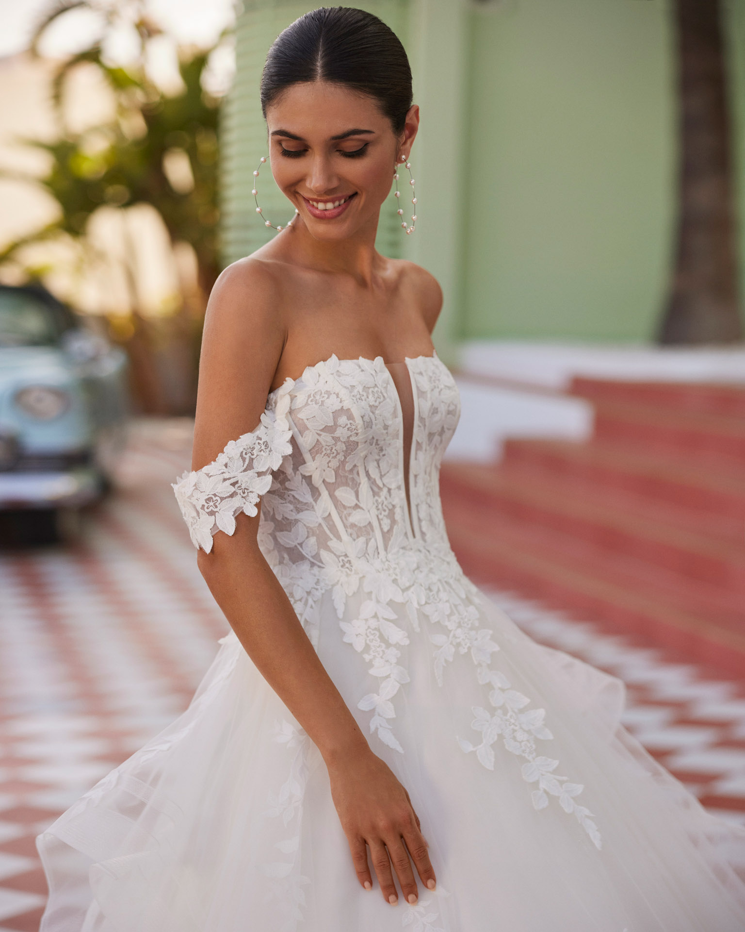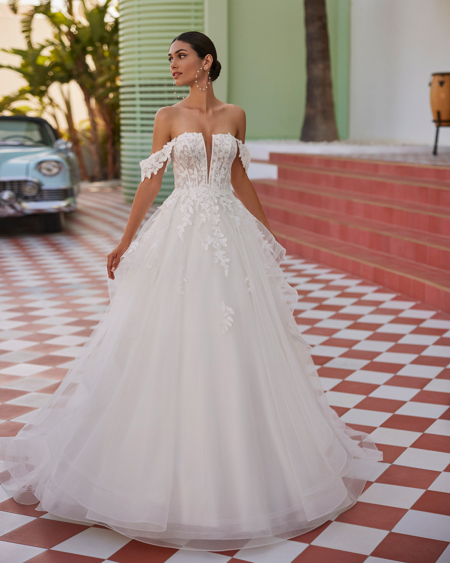 Robe de mariée longue et volumineuse avec dentelle et perles, décolleté plongeant, bretelles tombantes et dos bas.
