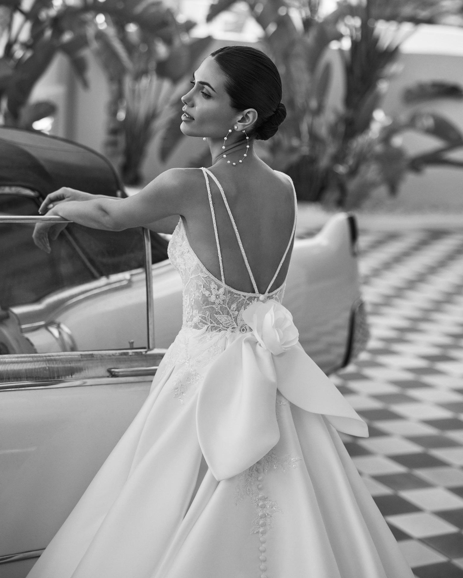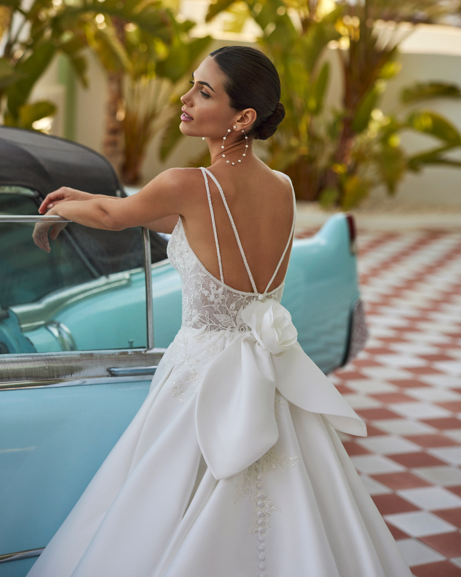 Robe de mariée longue et volumineuse avec un design en mikado, un décolleté en V, des bretelles perlées, un dos bas et un nœud.