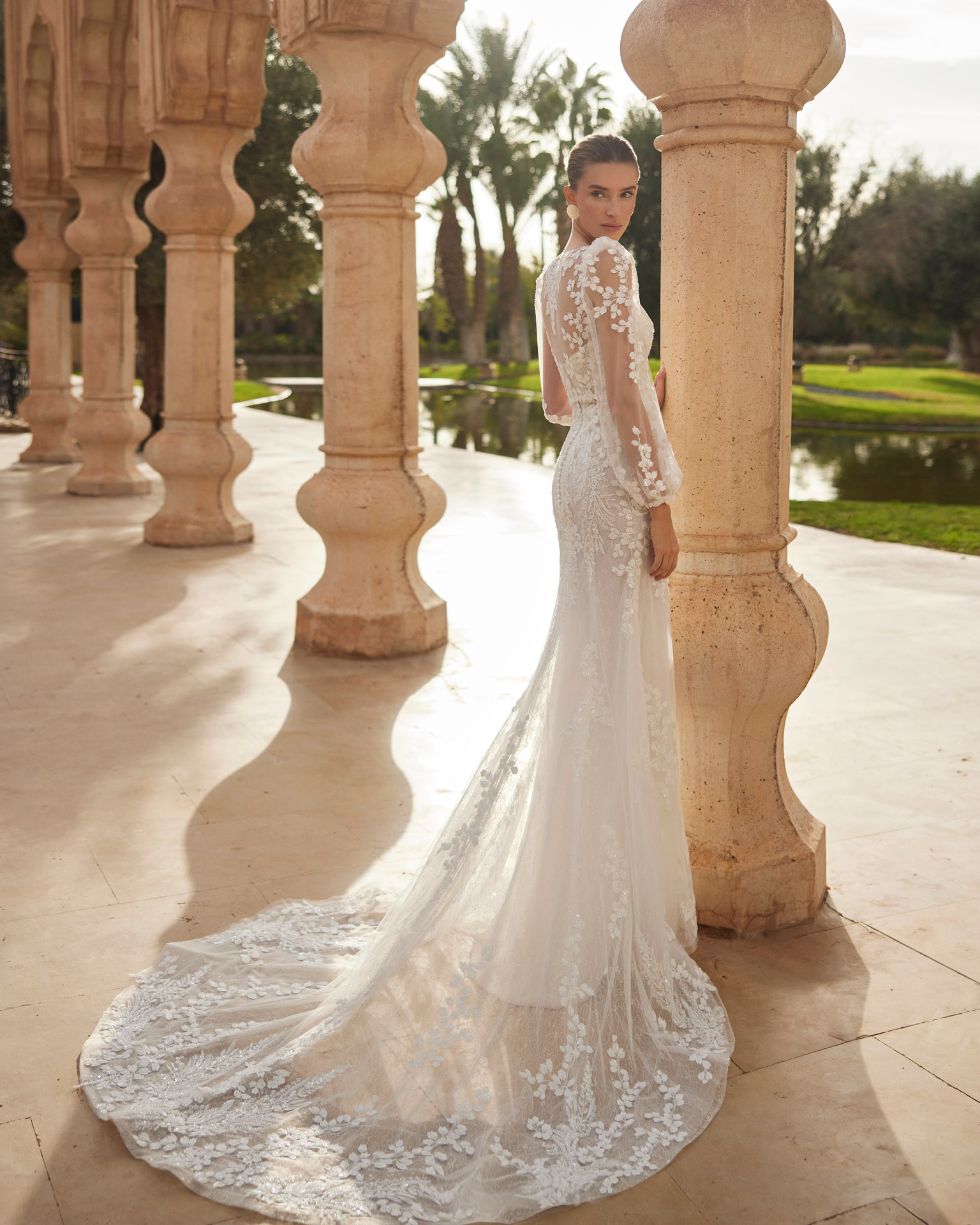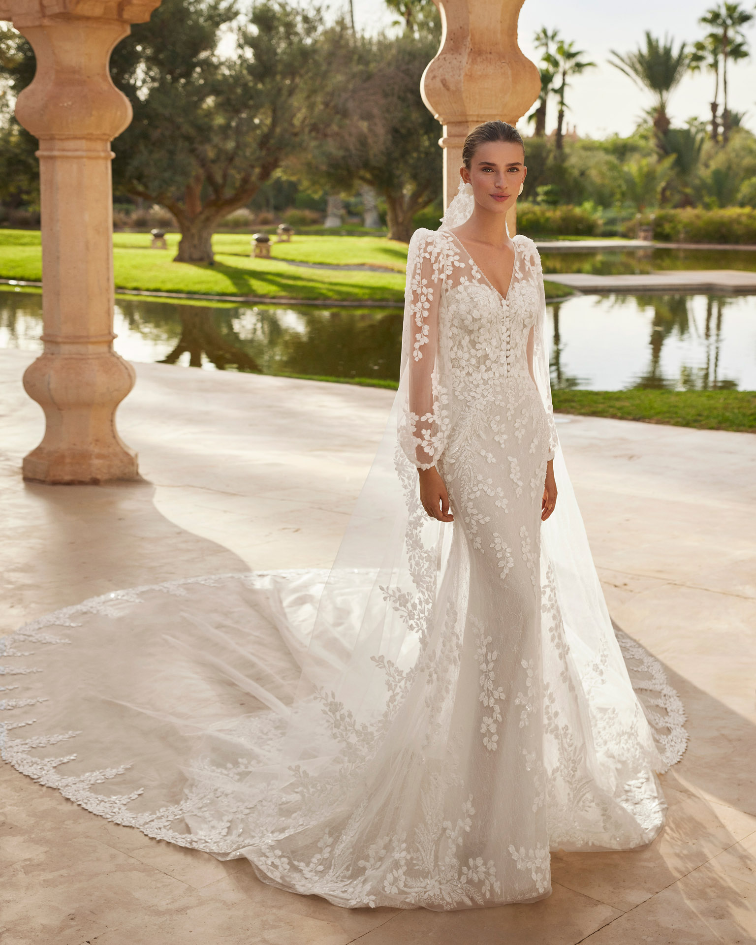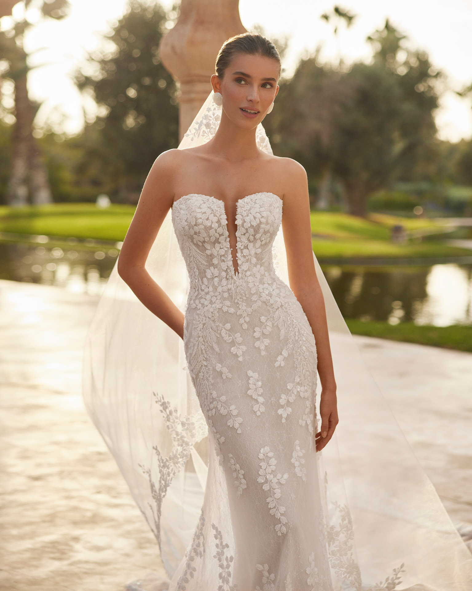 Robe de mariée longue, deux pièces, coupe sirène. En dentelle avec perles, décolleté bustier .