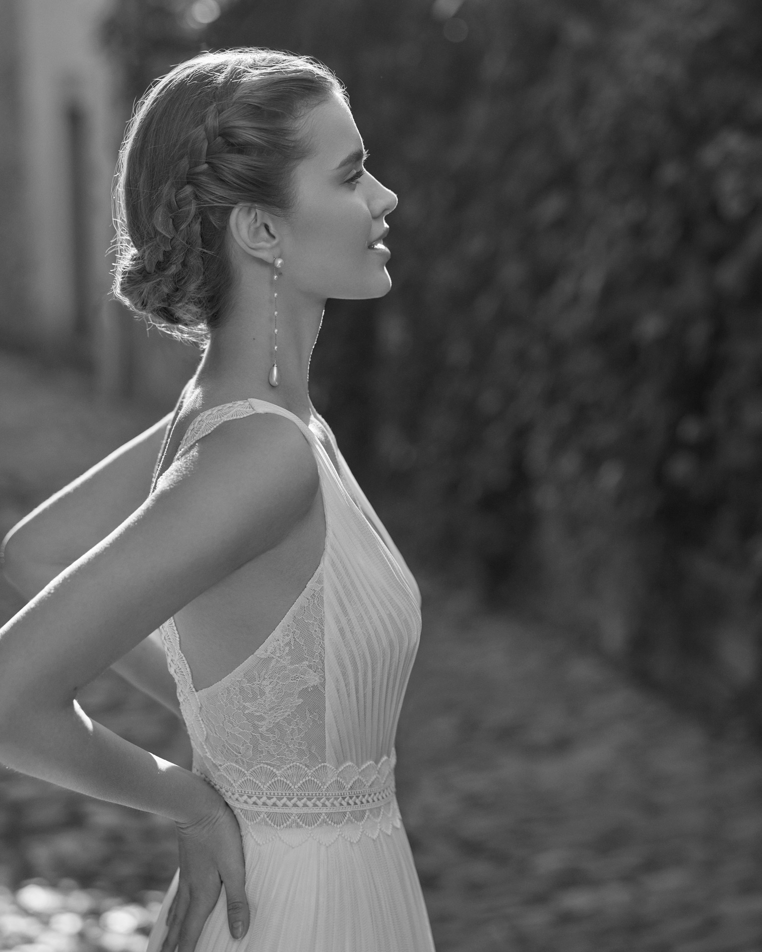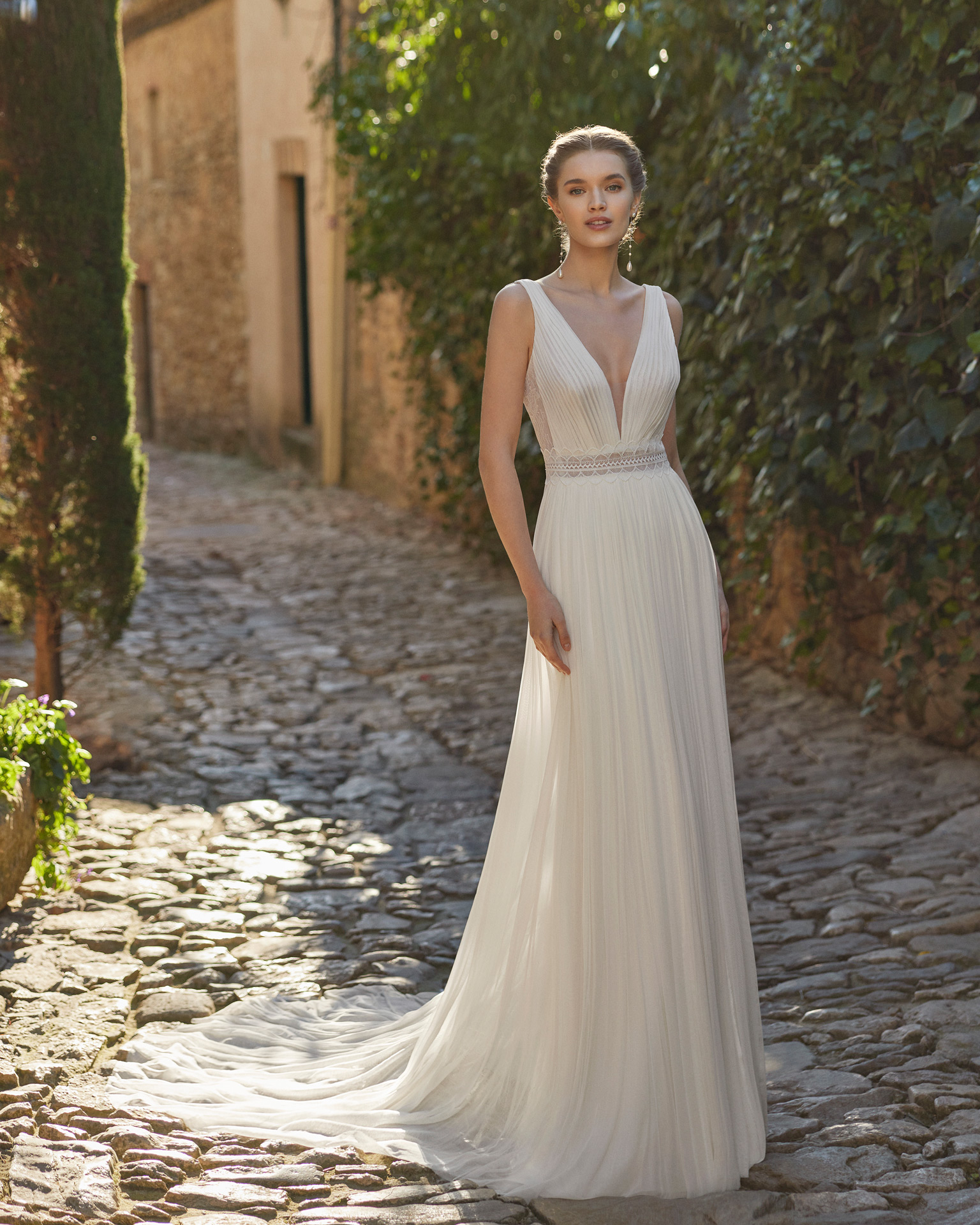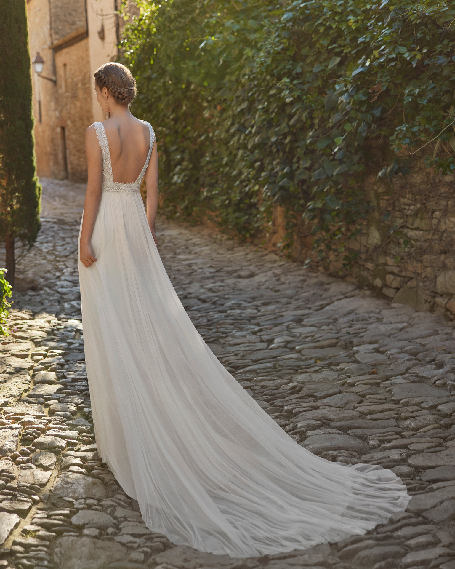 Robe de mariée coupe fluide de style élégant, confectionnée en mousseline rehaussé de dentelle  . Une tenue de mariée Rosa Clará.