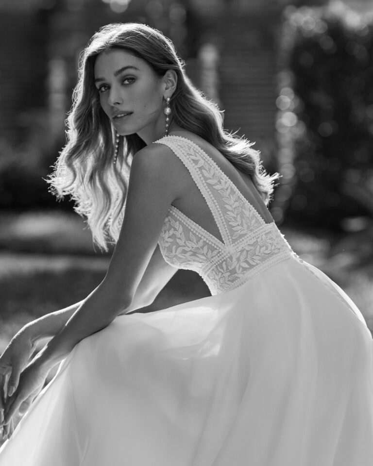 Des modèles délicats avec des bustiers en dentelle, avec de sensuelles ouvertures sur le dos. Les lignes pures marquent une partie de la collection, des jupes de tulles au grand volume, des robes de mariée coupe A-Line, des robes sirène….